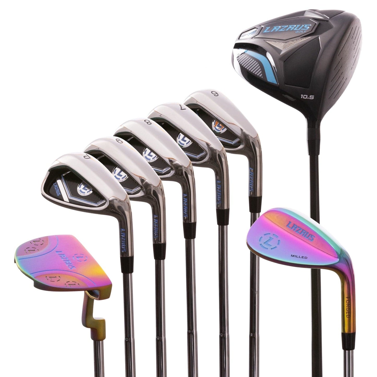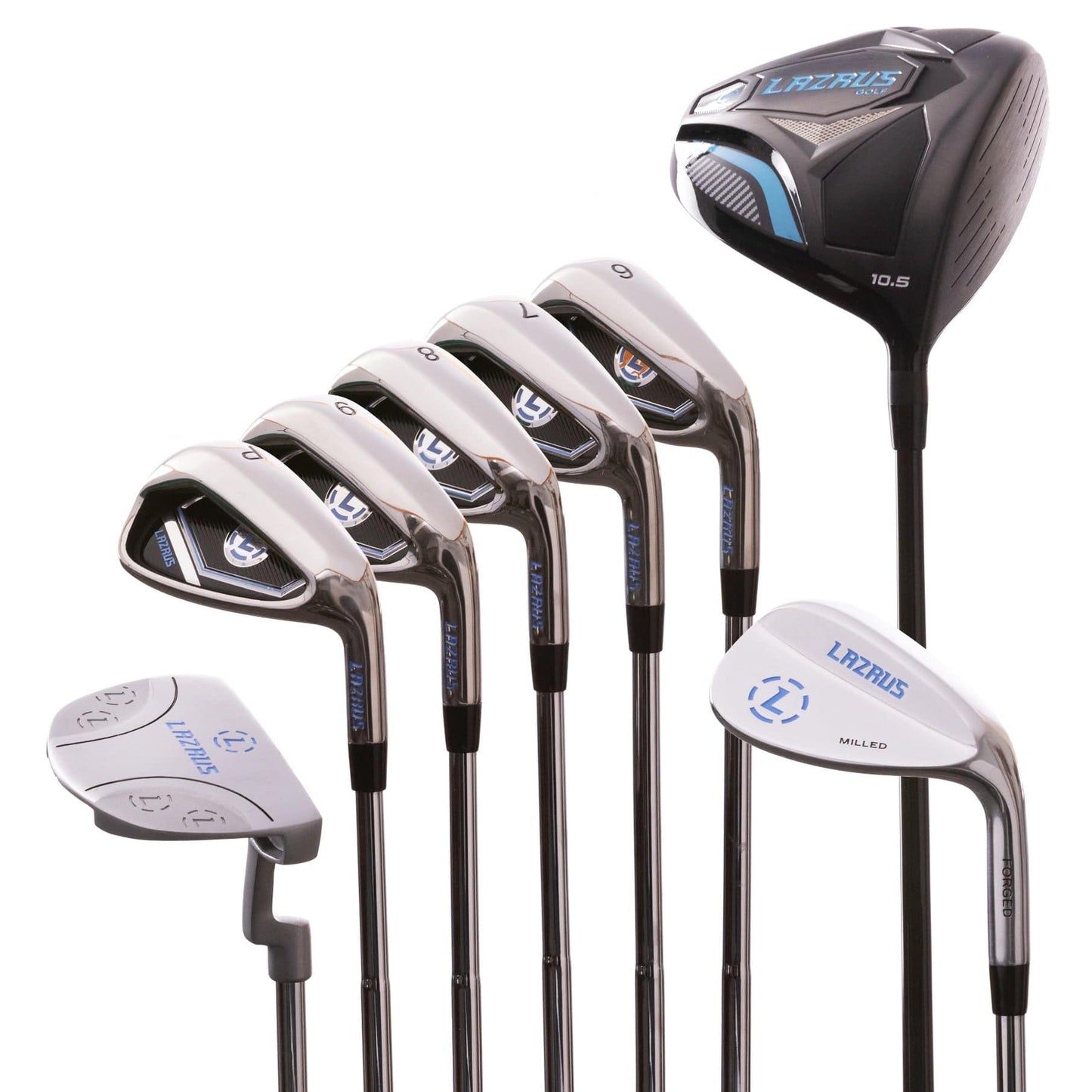 The Lazrus Golf 8-piece set includes a driver, 6-PW irons, 56° wedge, and putter in either right or left-handed options. The irons and wedge come in a sleek silver color, while the putter is a classic black mallet design. You can also choose between a 10.5° or 9° driver with a custom shaft. This unbeatable set comes with a 30-day money back guarantee.