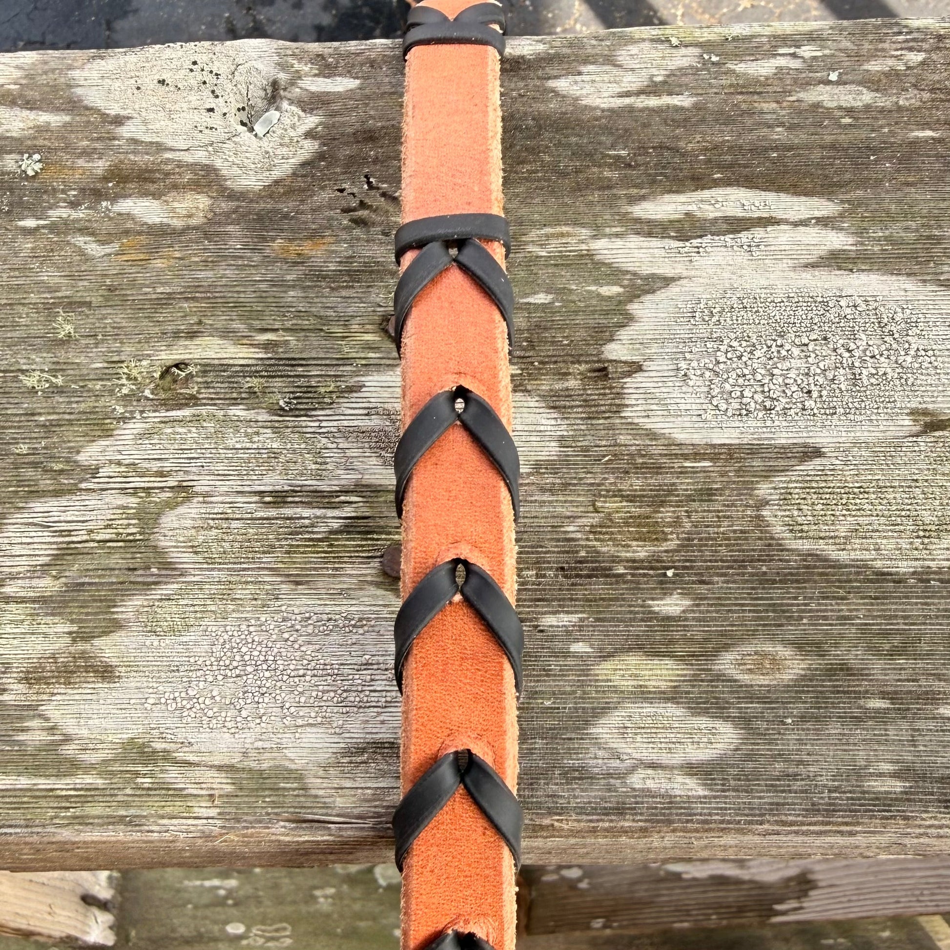 Leather barrel racing reins that have smaller laced leather to improve grip and stability while in the saddle.