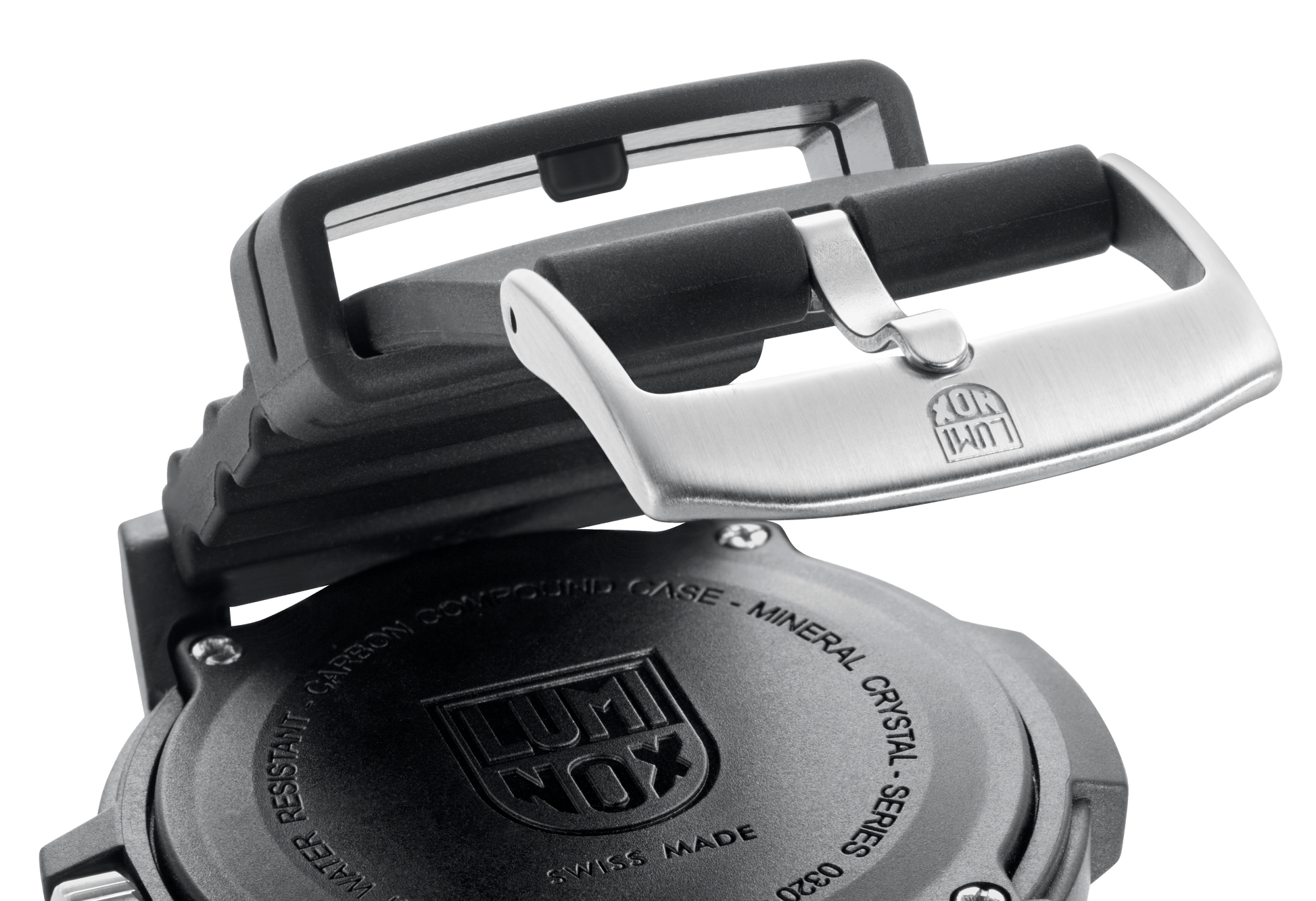 - Black signature PU strap with brushed stainless steel signature buckle, loop lock, 22mm