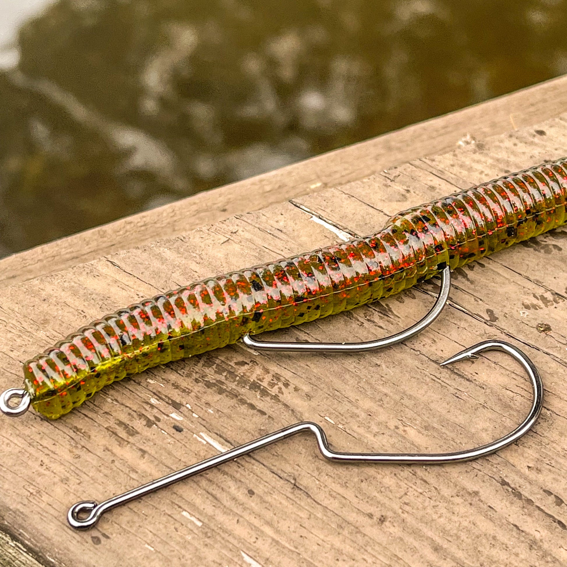 These hooks were originally designed and are used in our Snagless Punch Jigs. But, we thought why couldn't we use these hooks on long magnum worms. The hook point lays more towards the center of the worm, which should decrease the amount of short strikes. When we posted a video of us rigging a magnum speed worm on the 5/0 Long Neck, the strong interest was overwhelming. We had to make them available for anglers!