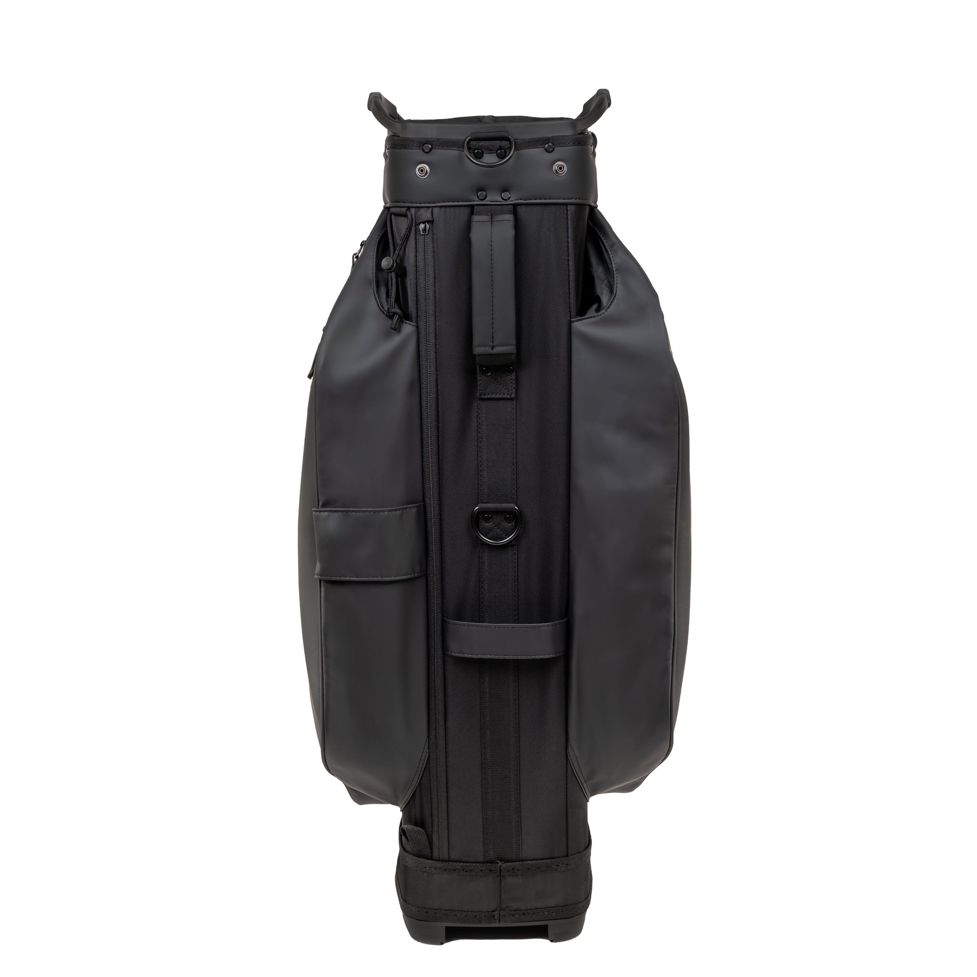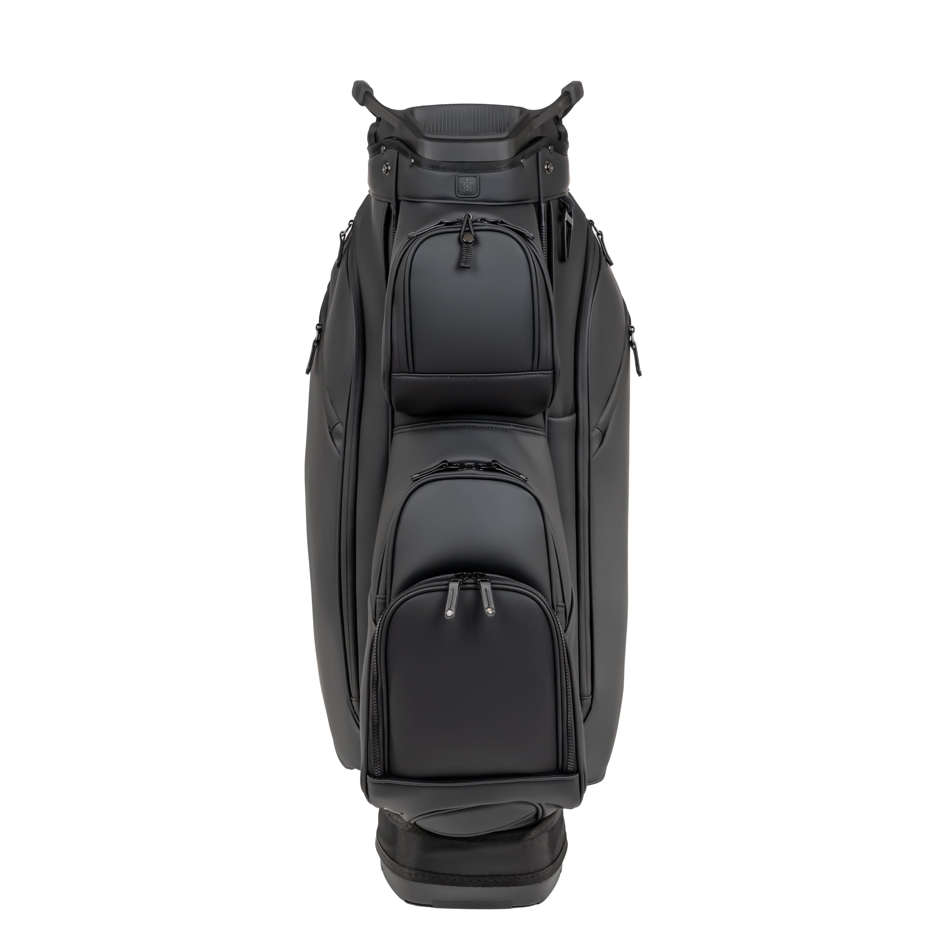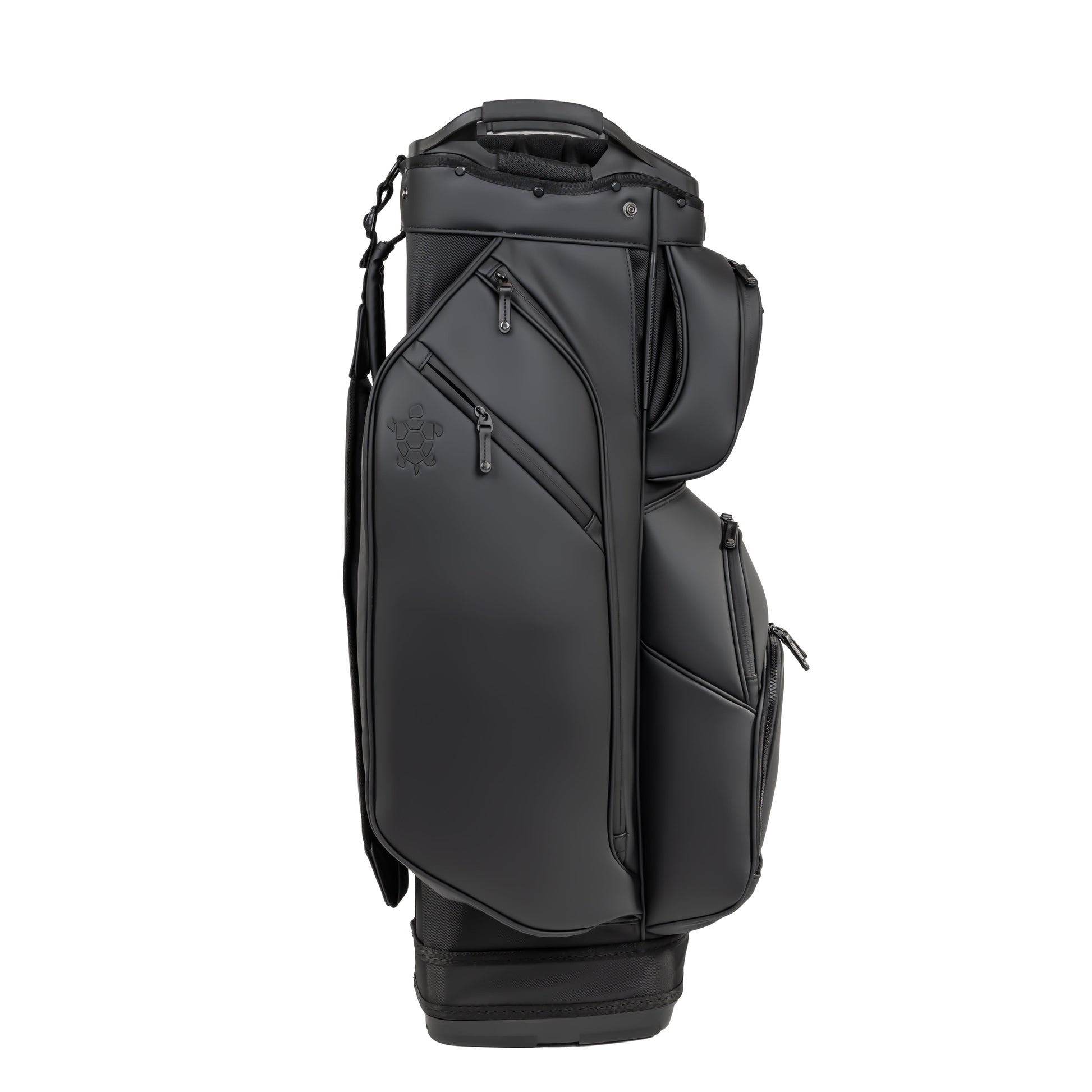 The ultimate companion for a smooth ride, the LUX Cart Bag delivers all the necessary functions, wrapped in a luxury VEGAN Leather package, which can commit all attention to your shots. Featuring three velvet lined luxury pockets for all valuables and electronics, all protected by waterproof zippers, ensuring contents stay valuable. A reinforced cart strap tunnel disappears behind your pockets, coupled with an over molded, rubber bottom ensures your bag remains stable on the cart while maintaining access to all your pockets during play. The removable front decoration pocket, single strap and carry handle, umbrella containment system, quick access electronics pocket, towel holder, external pen holder and a matching rain hood complete the functionality of this luxury masterpiece.