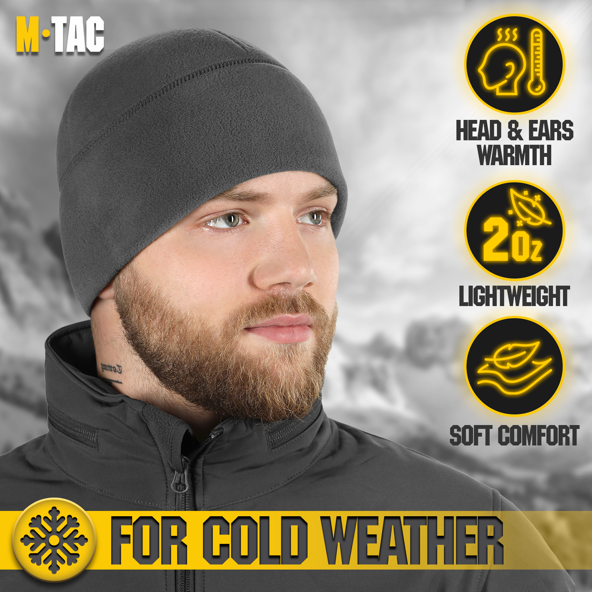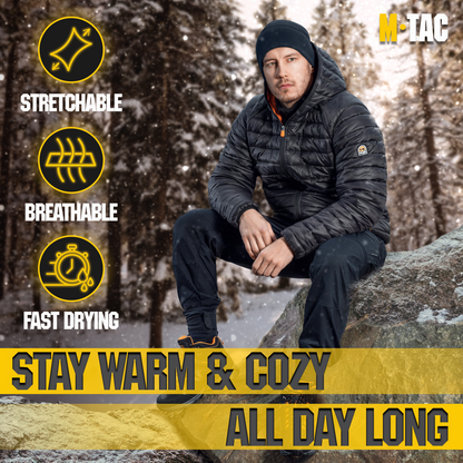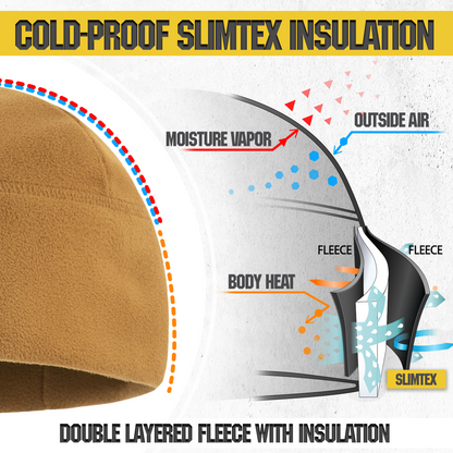 The M-Tac's lightweight and warm fleece hat for cold and extra cold weather. The hat is made of microfleece with a density of 270 grams, which makes it lighter than even the finest wool. The hat doesn't saturate the moisture and dries quickly. It also prevents itching and irritation. The low profile design fits easily under the helmet and hood. The Slimtex is a unique modern insulation that reliably retains heat, creates a feeling of softness and comfort. Slimtex is hygroscopic and hypoallergenic, and has a low thickness and high thermal insulation, flexibility, elasticity, and durability. Using this particular insulation you get reliable warmth without unnecessary bulk.