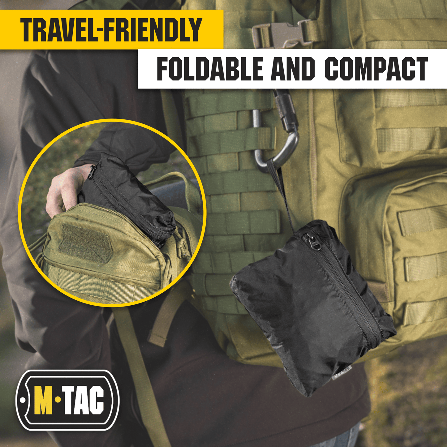 The M-Tac Raincover backpack cover for rain and snow protection. The cover has a waterproof coating. Simply attach this ultralight cover to your backpack with two straps to make it snow-, water-, and dirt-proof. Protects your backpack and what it holds, under any weather conditions. Ensure your belongings are safe during any hikes, camping trips, or travels. The obscuring olive color is perfect for the army, hunters, and fishers.