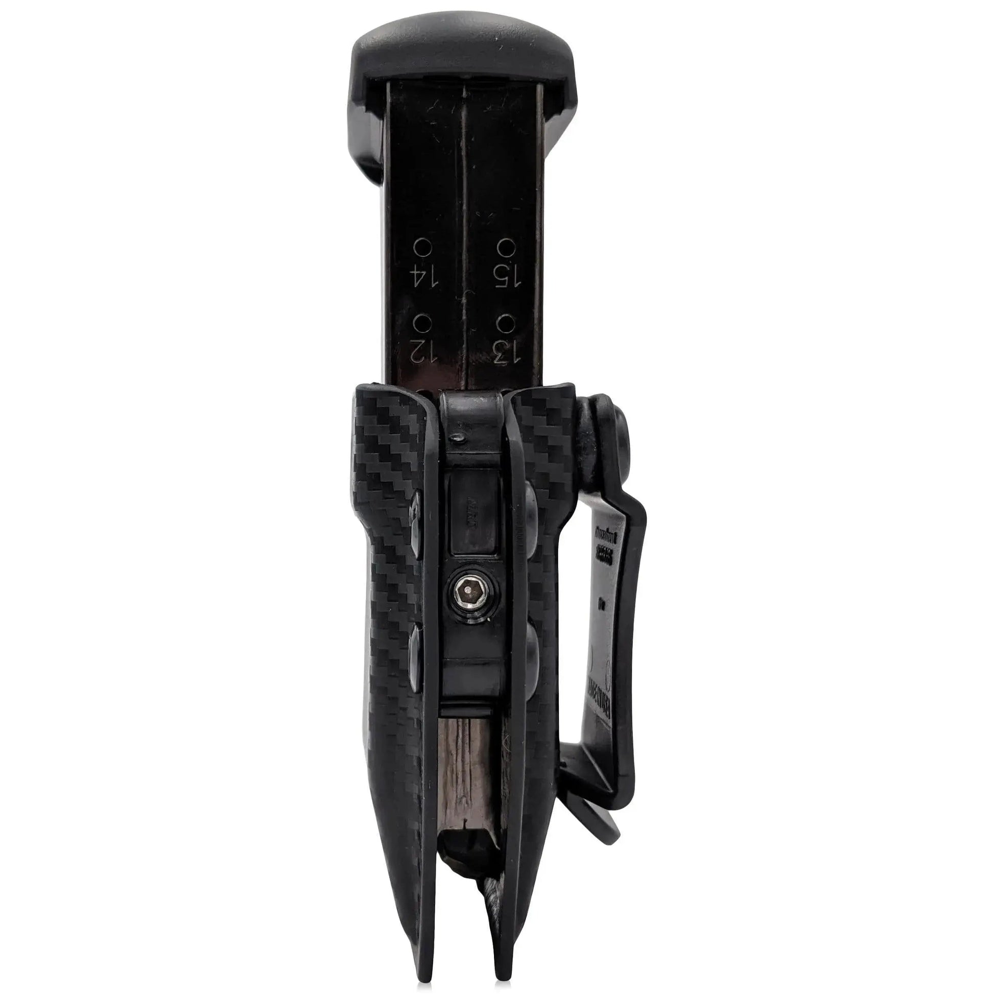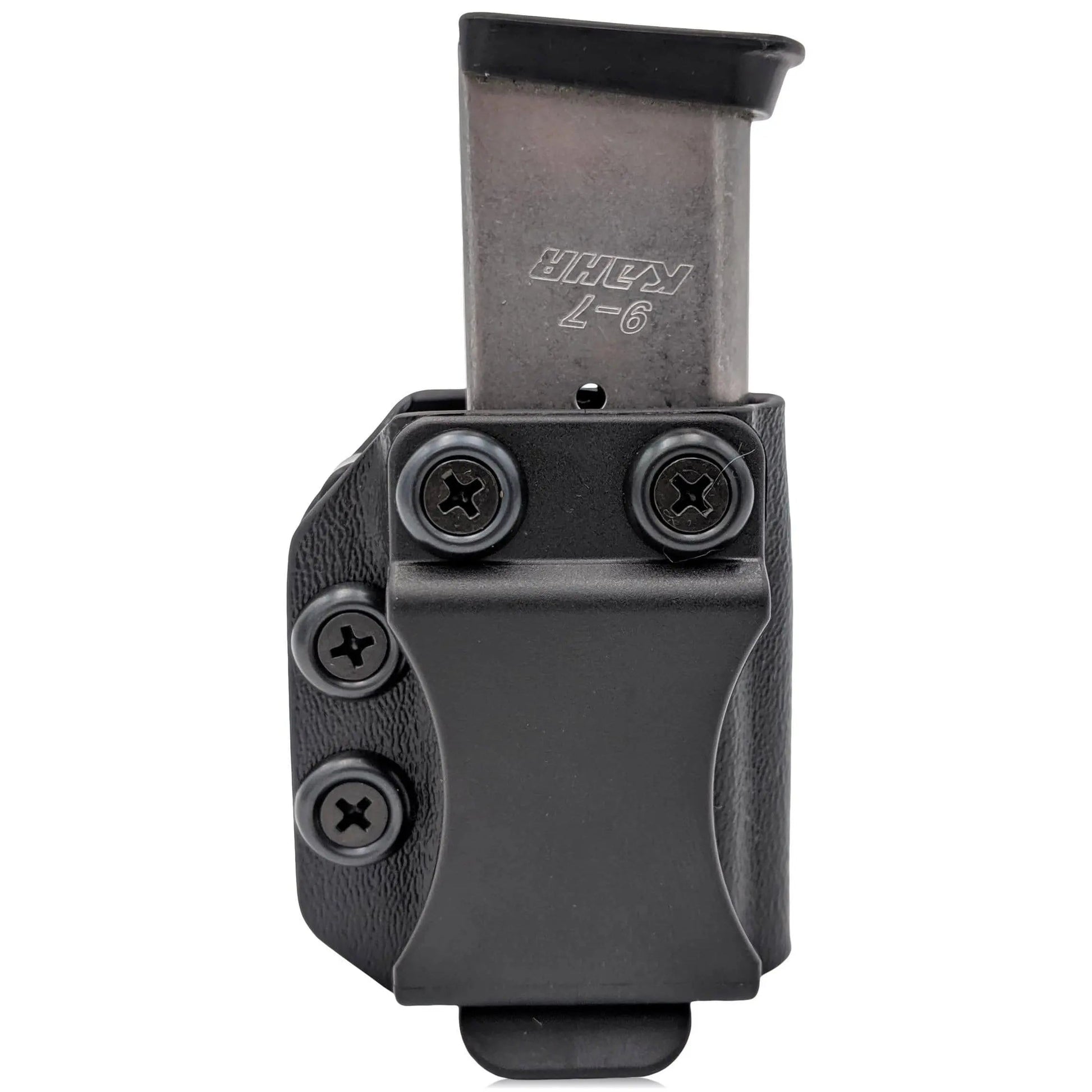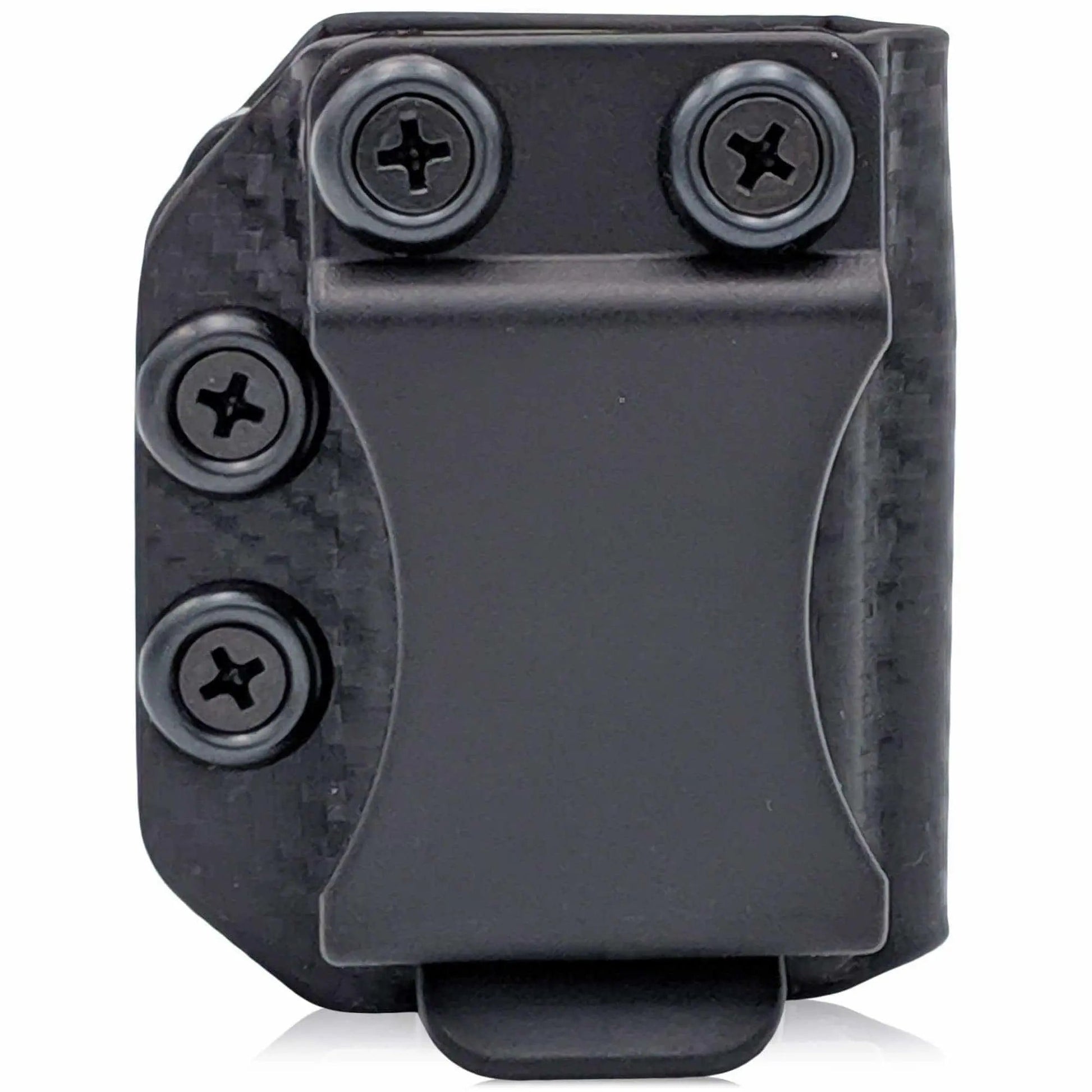 Ambidextrous, Magazine Holster (IWB/OWB - KYDEX). Carry your spare mag with you at all times. Extremely versatile with mounting holes on both sides to accommodate your preferred carry position for either IWB/OWB Carry and Right Hand/Left Hand Draw. Mag Holster comes fully assembled for RH IWB Carry, but is easily reconfigurable with just a Philips screwdriver. Our MRD magazine holsters come with a 1.5" Belt Clip.