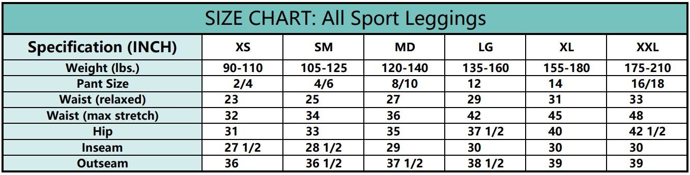 Due to the high Spandex content, our All Sport Leggings have a great deal of stretch so they typically grade out about a half of a size bigger than expected. If you are trying to decide between two sizes or think you may be "in between" sizes, I think you will generally be happier going for the smaller size.