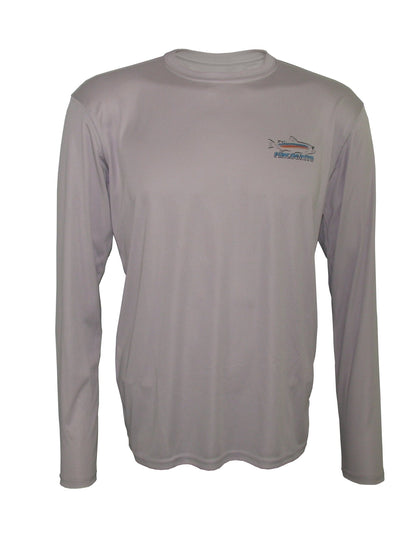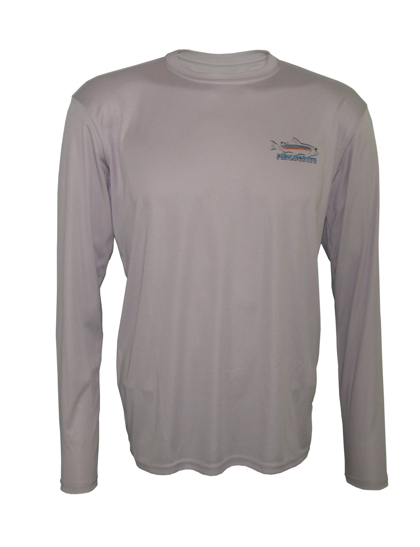 Lightweight sun protective SPF 50 fishing shirts. We place Travis Sylvester's "Whiplash" on the back of this athletic grey-colored long sleeve T. The Fincognito logo adorns the left chest. 100% polyester with PURE-Tech wicking technology. Our fly fishing apparel works well on the water or as hiking clothes on the trail. Great sun protection, moisture wicking apparel.