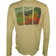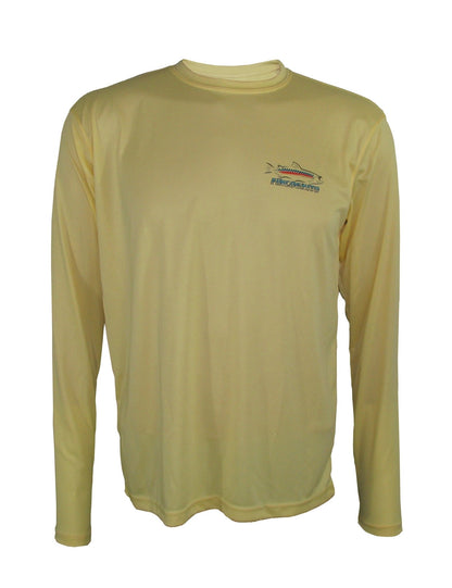 Lightweight sun protective SPF 50 fishing shirts. We place Ed Anderson's "Colored Brown" on the back of this pale yellow-colored long sleeve T-shirt. The Fincognito logo adorns the left chest. 100% polyester with PURE-Tech wicking technology. Our fly fishing apparel works well on the water or as hiking clothes on the trail. Great sun protection, moisture wicking apparel.