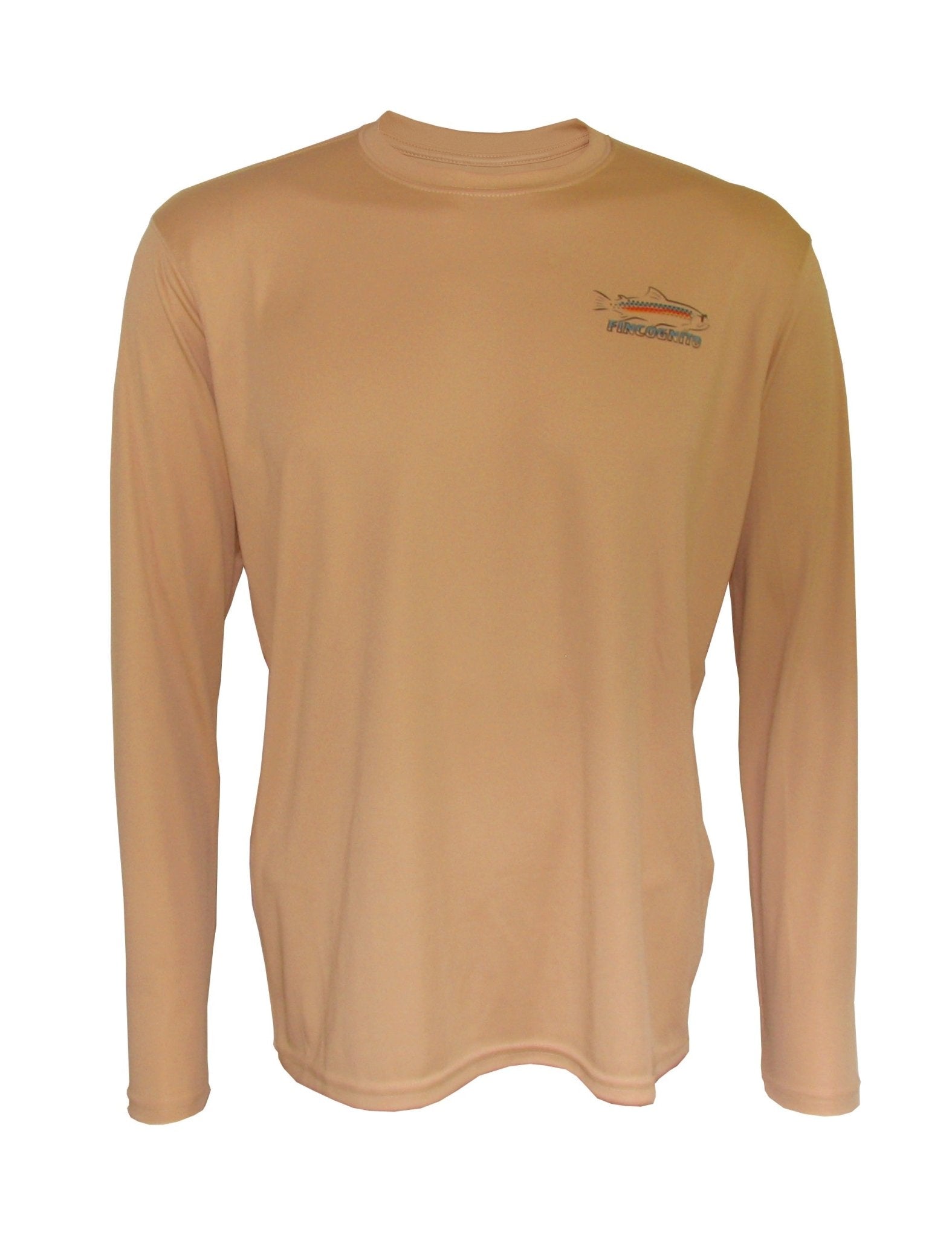 Lightweight sun protective SPF 50 fishing shirts. We place Ryan Keene's "Brown Trout" on the back of this tan-colored long sleeve T. The Fincognito logo adorns the left chest. 100% polyester with PURE-Tech wicking technology. Our fly fishing apparel works well on the water or as hiking clothes on the trail. Great sun protection, moisture wicking apparel.
