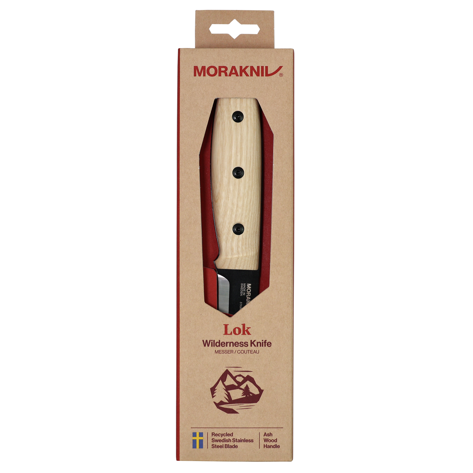 A robust full tang wilderness knife, the Lok is built to withstand the most demanding and heavy-duty situations.The full-bodied handle and finger guard is made of carefully selected bright ash wood from European FSCⓇ certified forests. Combine that with the 3.2 mm thick blade made of recycled Swedish stainless steel, and you have the ultimate wilderness-ready knife. A beautifully balanced contrast between the bright ash wood and the shiny edge of the blade is made possible by the black PC-coating. Protect the sharp edge of the knife with a vegetable tanned leather sheath, designed with a belt loop. Keep your campfire ablaze with the fire starter compatible blade.