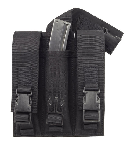 This MP5 9mm triple magazine pouch is constructed of 1000 denier nylon with quick release buckle closure. The MOLLE triple mag pouch holds 3 MP5 magazines or 3 9mm 30 round stick magazines.