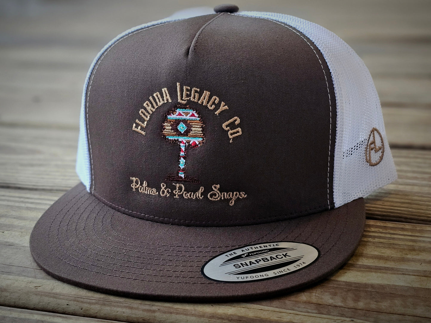 Experience a touch of elegance with Florida Legacy Co.'s Palms & Pearls BW cap. Crafted with Yupoong's Flatbill Brown and White Mesh, this cap offers a sleek and stylish look while providing a comfortable fit. Perfect for any occasion, this cap is a must-have for any fashion-forward individual.