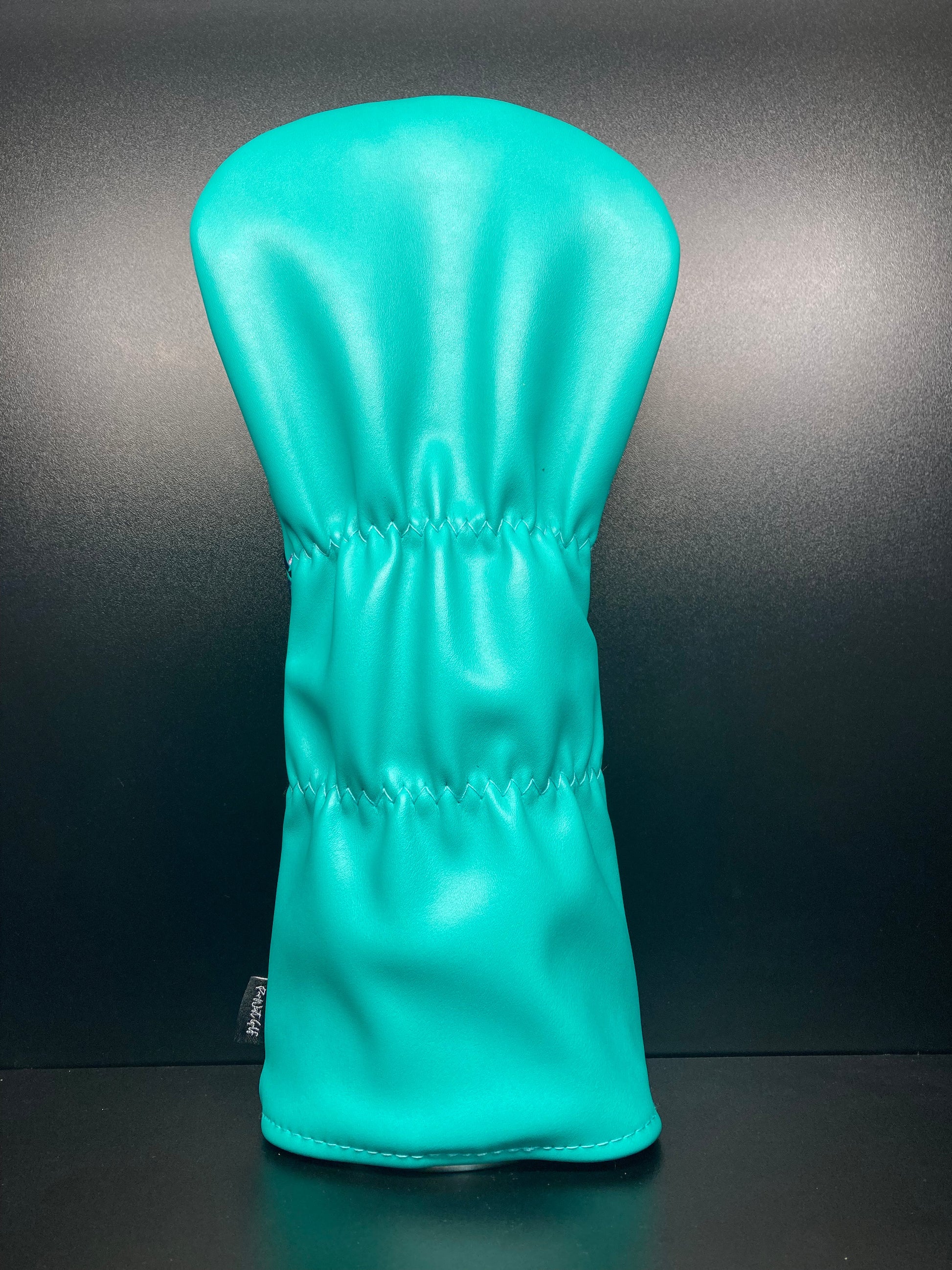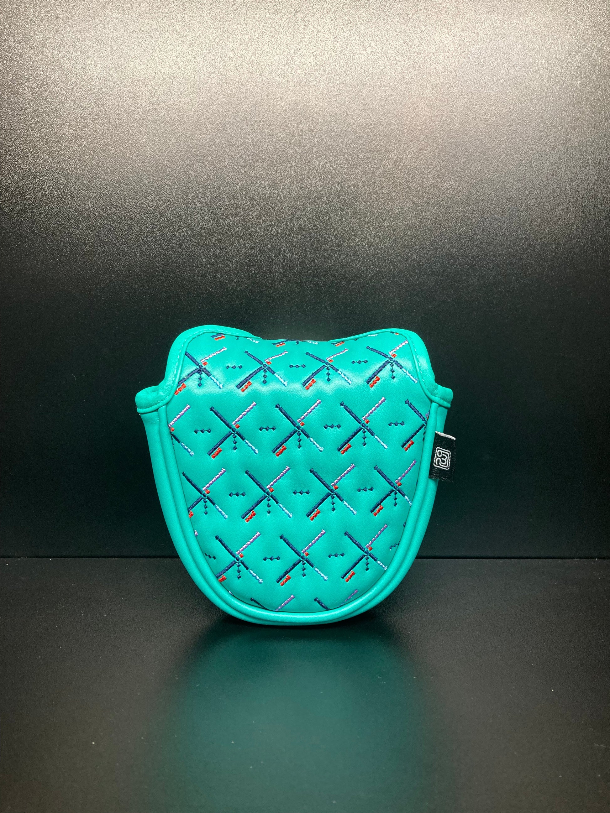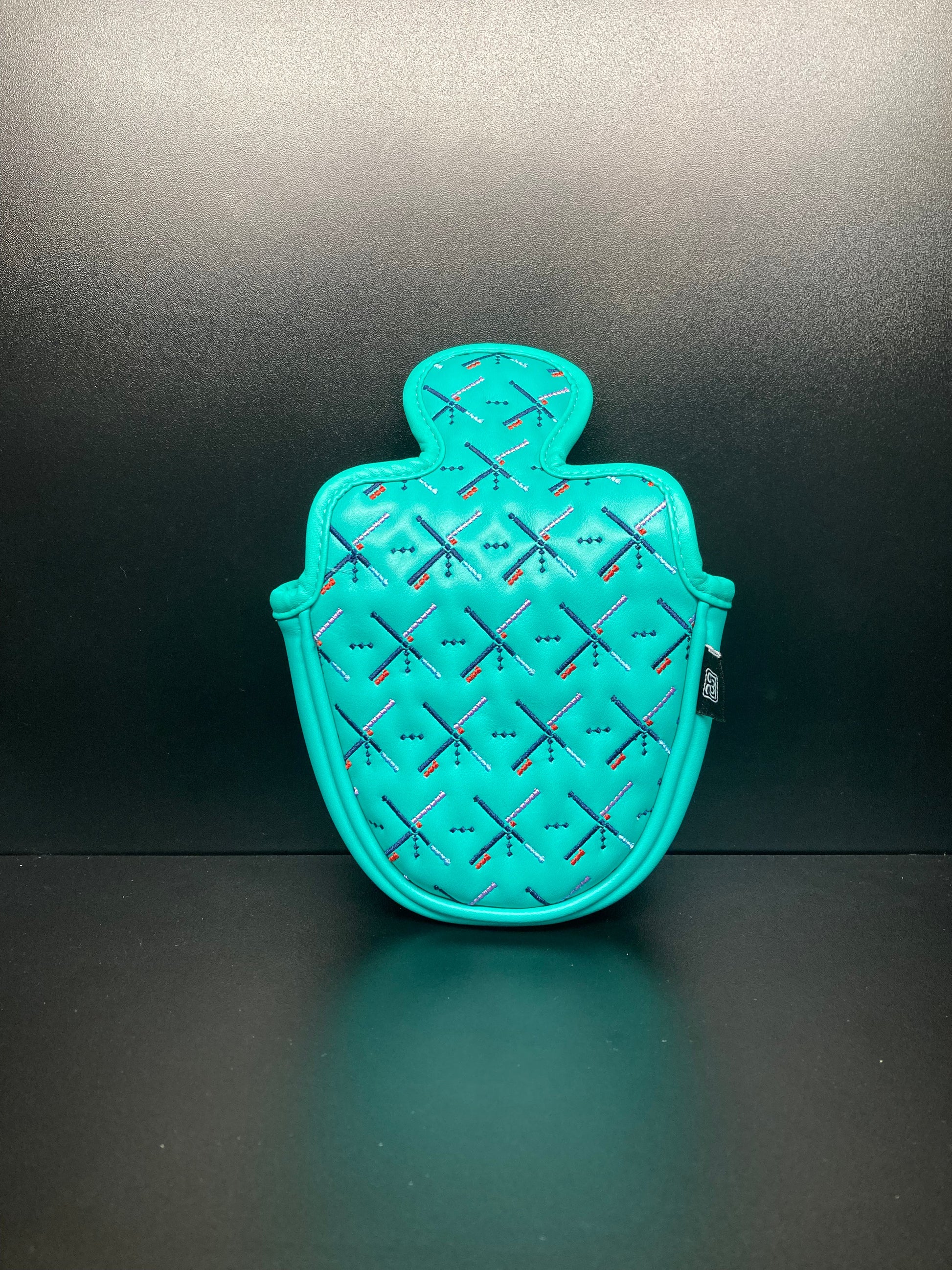 This vibrant golf headcover pays homage to the iconic Portland International Airport (PDX) carpet pattern. Featuring a turquoise base, adorned with a repeating pattern of intersecting lines and colorful accents, reminiscent of the beloved geometric design. The intricate details include crossed-lines and decorative dots in shades of blue, white, red, and purple, giving it a unique and eye-catching aesthetic.