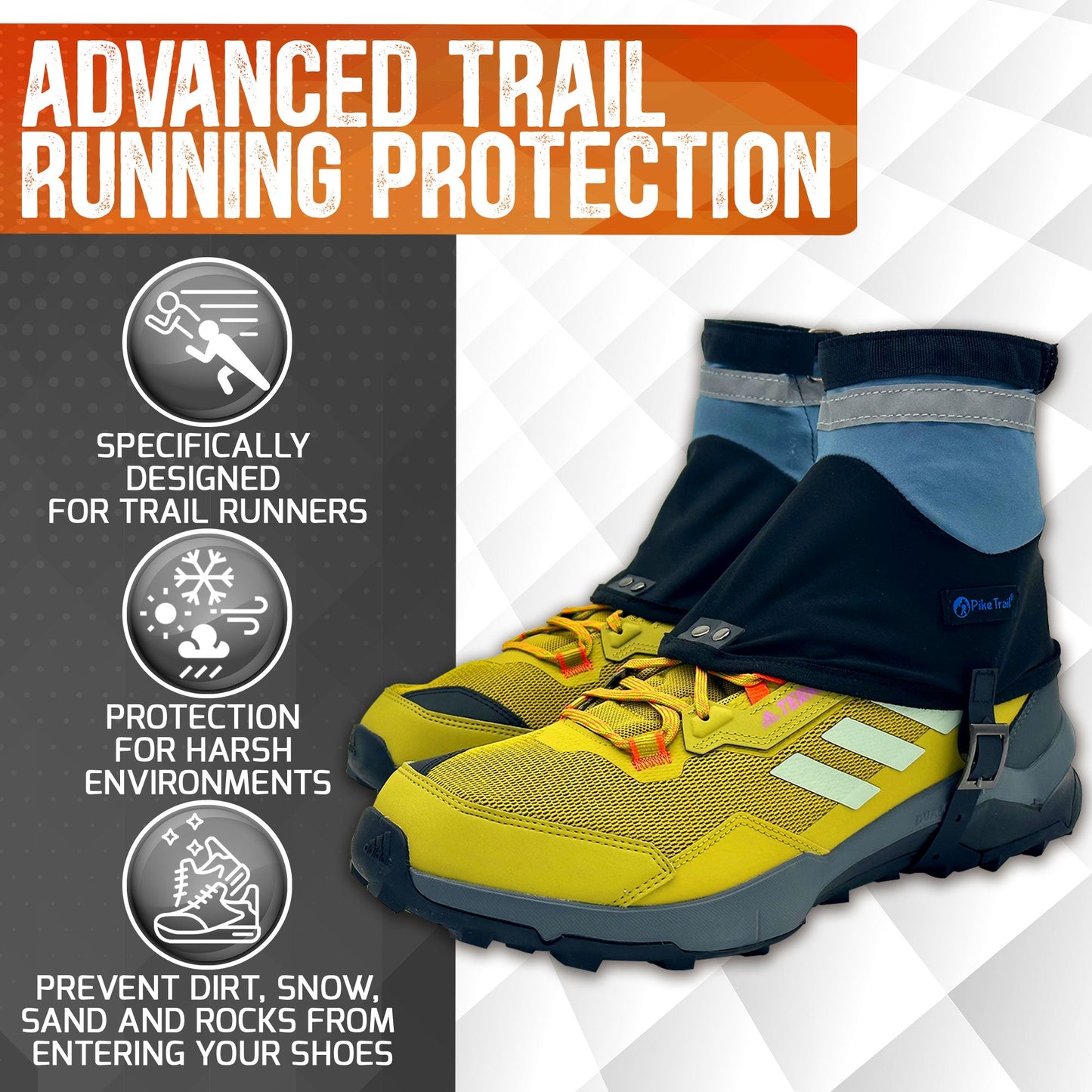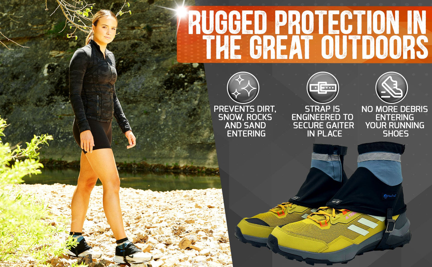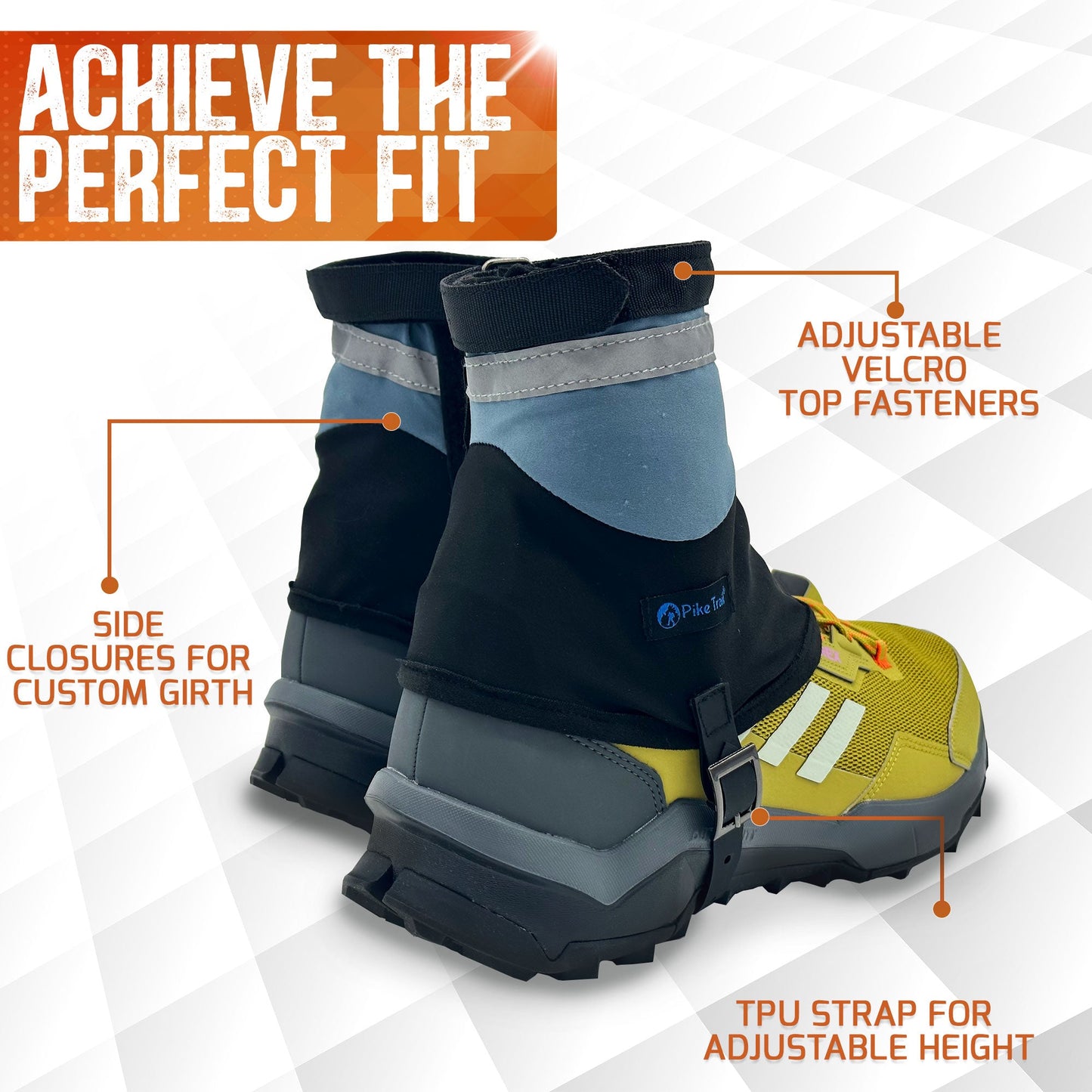 Everything you expect in a Pike Trail Gaiter.. Adjustability, Comfort and Durability. From Big to Small Runners - our one-size-fits-most running gaiter is the perfect companion for your next long distance trail run. It is designed with a breathable outer layer which makes you forget that it's even there. Super Comfortable All Day Protection in an ultralight package!