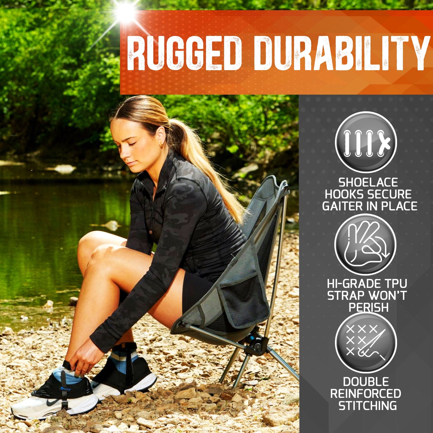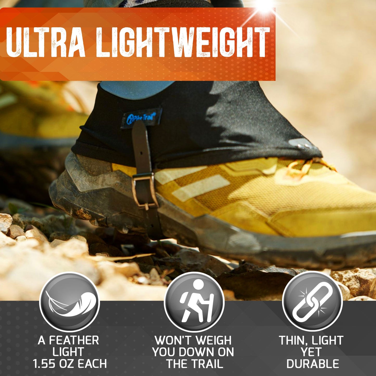 * Durable All Weather Cold Temp Rated Foot Strap to lock your gaiter in place