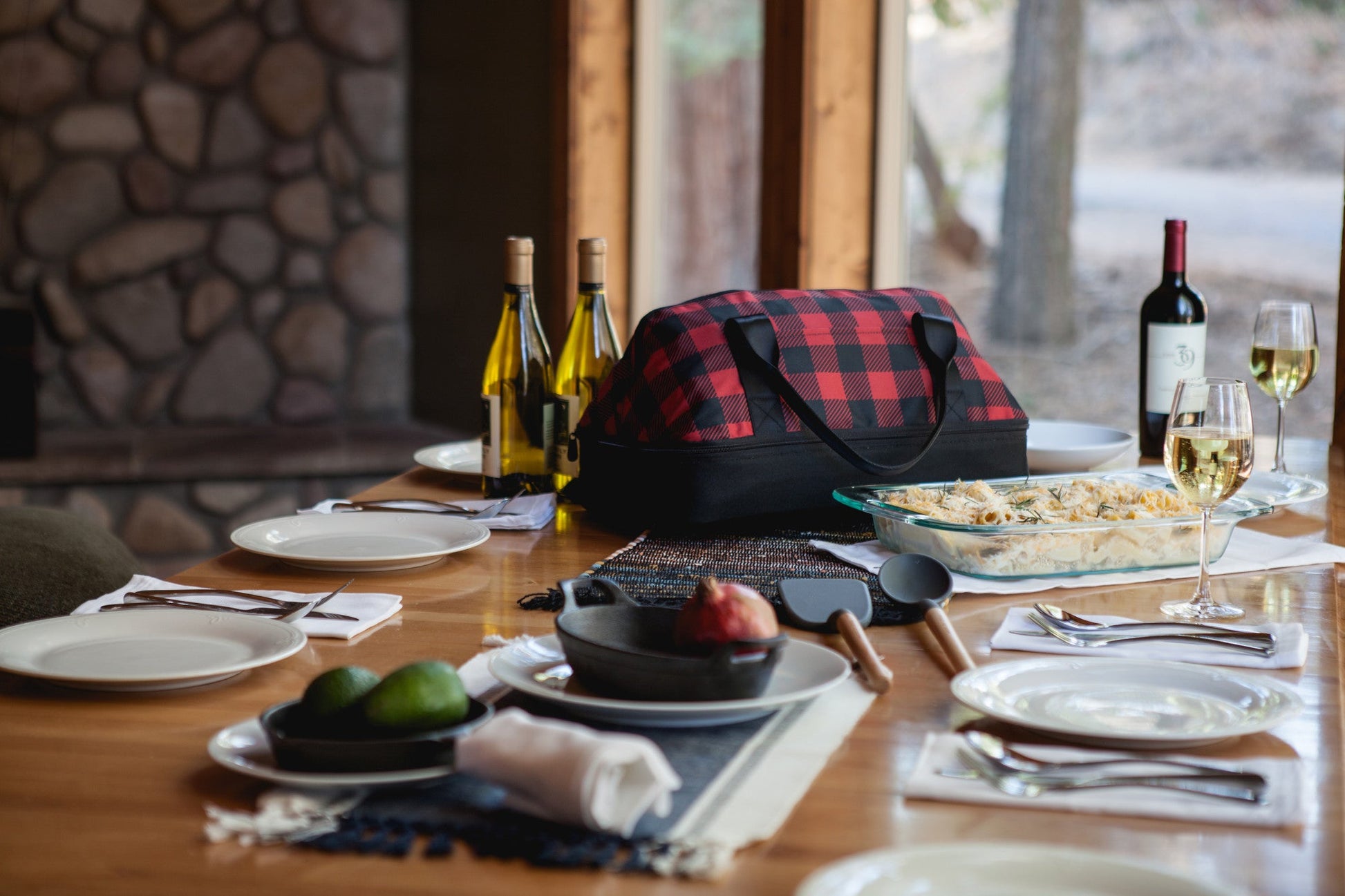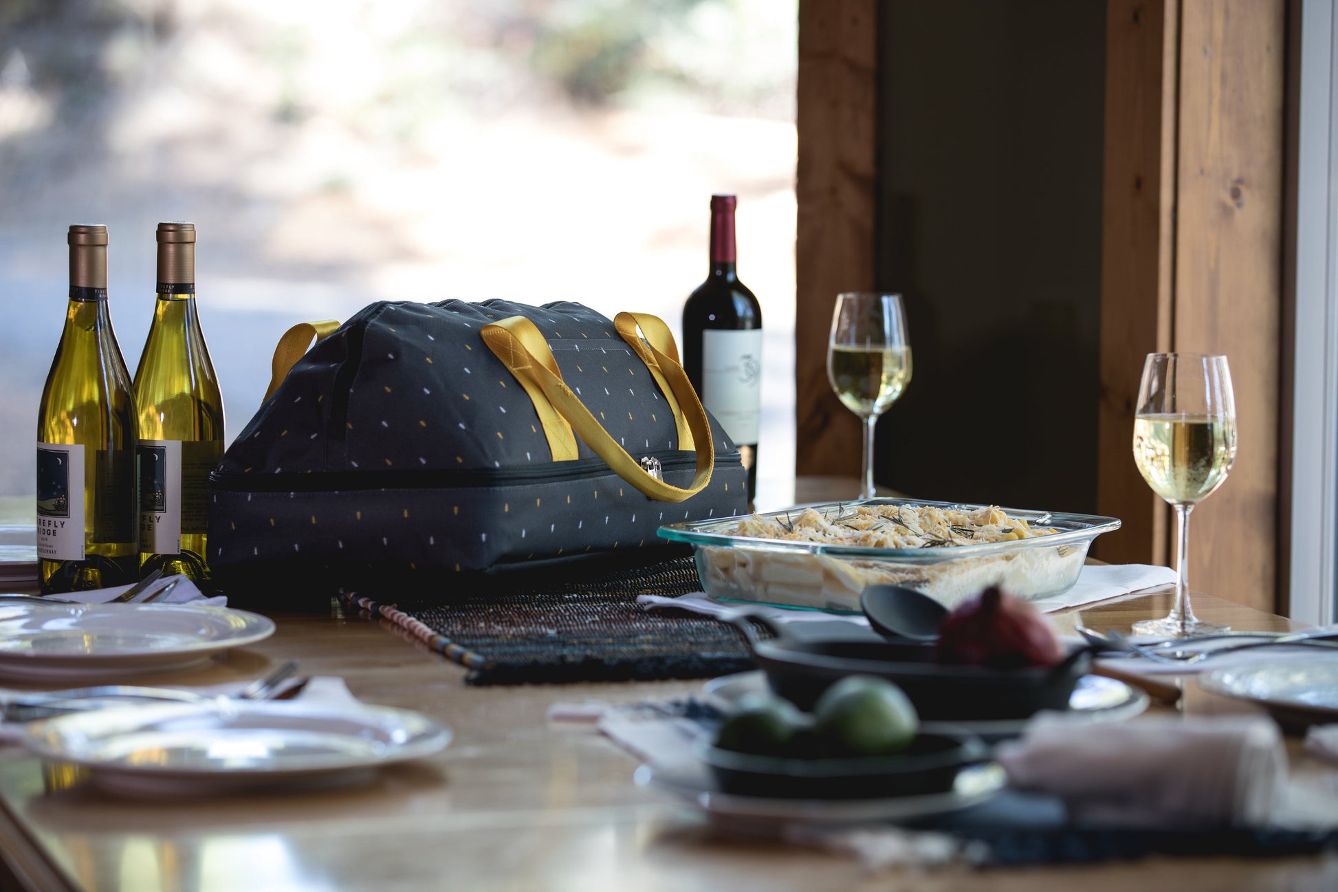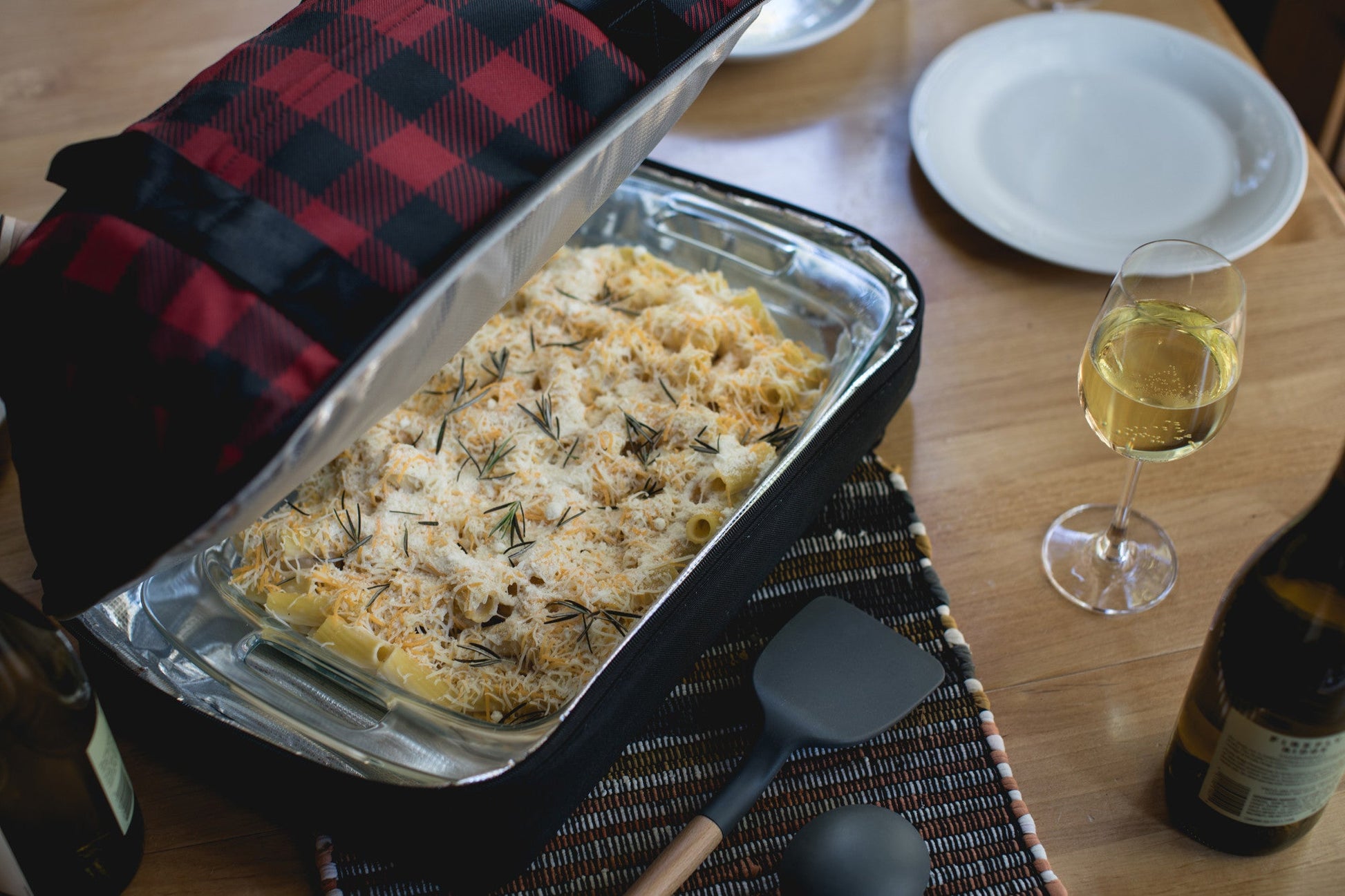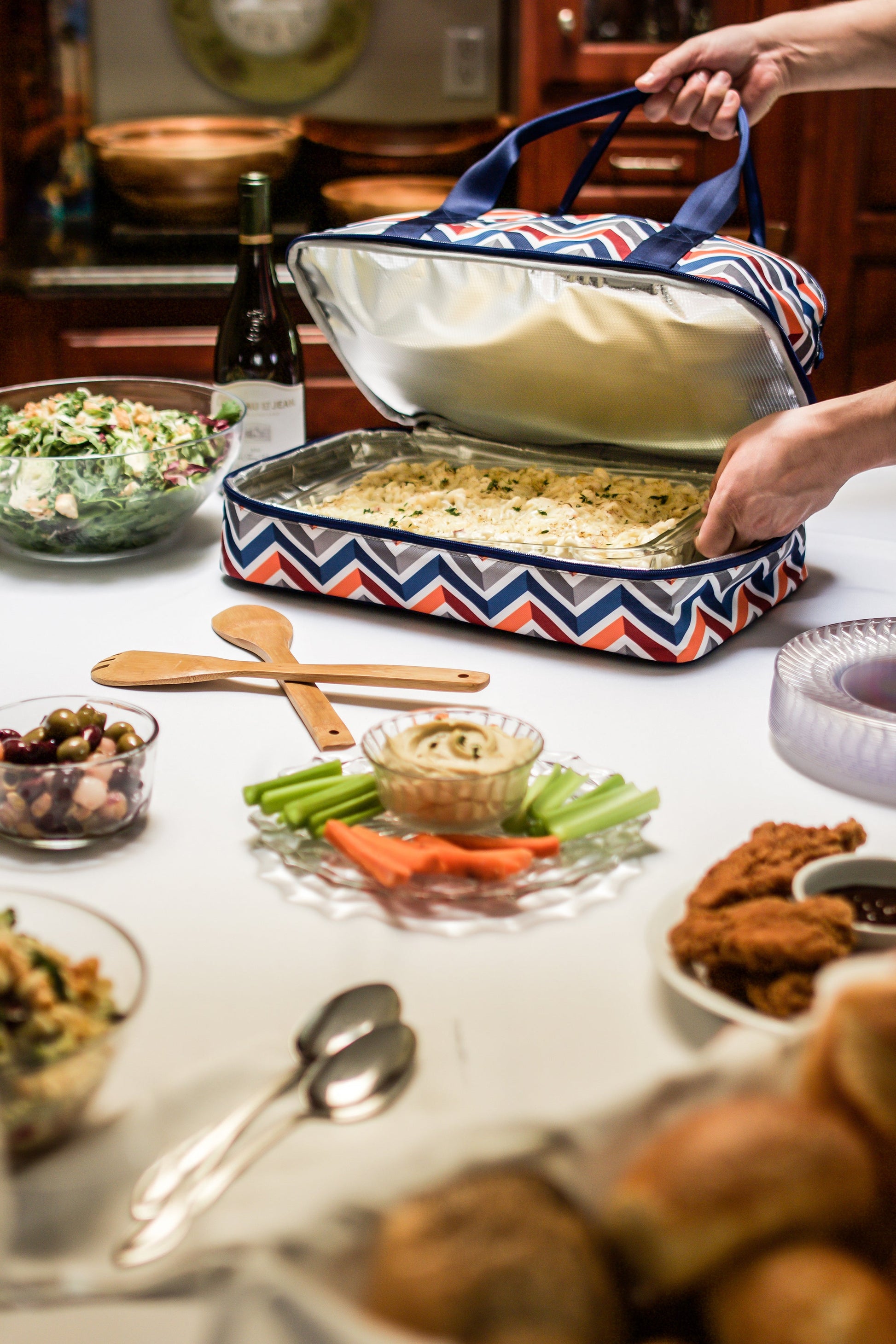 Looking for a smart way to get your beautiful dish to the dinner party, intact? The Potluck Casserole Carrier Tote was made especially for moments like these. This “Lasagna Lugger” has a large insulated compartment to use as a cooler or to store and transport casseroles up to 300 degrees Fahrenheit. There’s additionally a spacious, non-insulated top compartment for serving utensils or other shelf-stable food items. Large handles make it easy to transport your casserole upright, two elastic loops at the back hold one large serving utensil (not included), and a framed window slot for your identification card ensures your casserole bag will make it back to your kitchen. Fitting any 9 by 13 inch casserole or pyrex dish, this premium casserole carrier gets your dinner party masterpiece delivered to the buffet in style. This tote is an essential piece of any good potluck party.