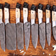 Upgrade your culinary experience with this custom handmade Damascus kitchen knives set. Crafted from high-quality Damascus steel, these knives offer exceptional sharpness, durability, and precision cutting. The handles, made from bone and buffalo horn with a steel bolster, provide a comfortable grip and an elegant touch. With sizes ranging from 13 inches to 8 inches, this set is ideal for all kitchen tasks. Comes with a luxurious leather roll for safe storage and portability.