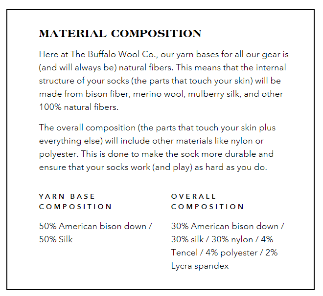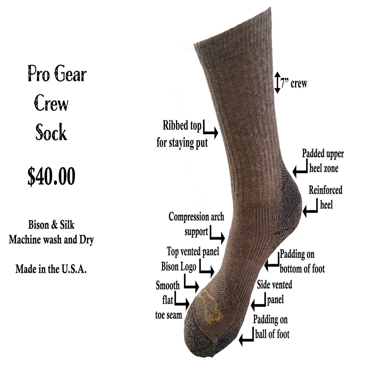 We created a sock from Bison down and silk that will keep your feet warm and dry all winter long. When summer comes, don't worry, they will also provide dry cool comfort in hot environments, with superior moisture regain properties, and exceptional air-flow almost double the wicking of fine wool. (keeps your feet dry and sweat free)