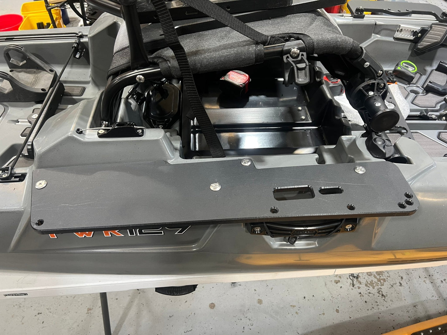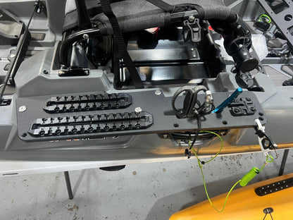 The Mega Accessory Plate allows for additional track work to be mounted onto your PWR 129, including a built-in tool holder and designated areas for lanyard attachment. It can fit on either side of your kayak and comes with the necessary hardware for mounting.