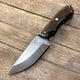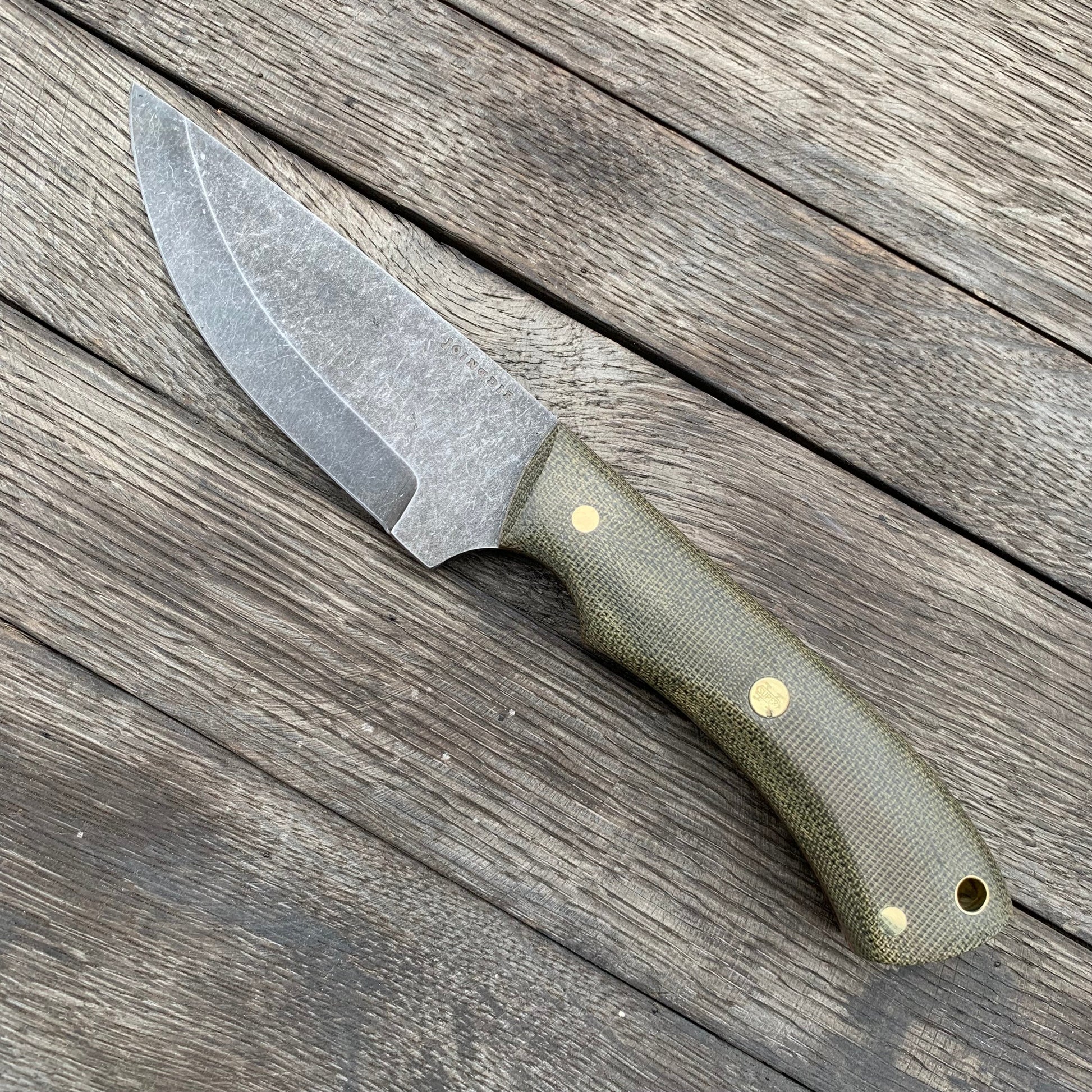 This Bushcraft style blade is made from 80CRV2 high carbon steel and has a scandi grind with stone wash patina. Canvas micarta and orange G-10 make up the handle which is attached with brass fittings and a .22 shell casing. Blade length is 4” and overall is 8 3/4” - sheath included.