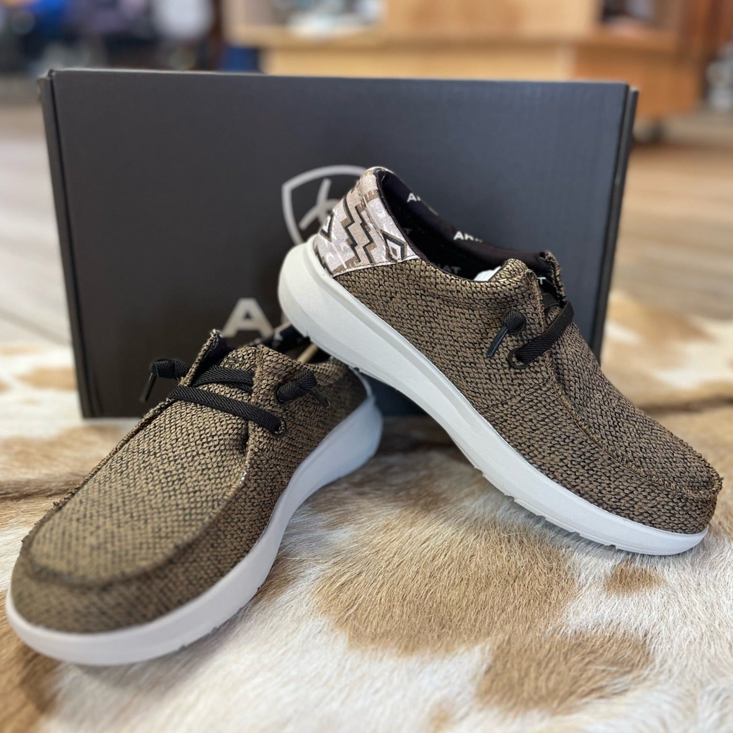 The Men's HILO 2.0 features a heathered sand stretch fabric, with a brown Aztec pattern on the back and white laces. Style# 10042506