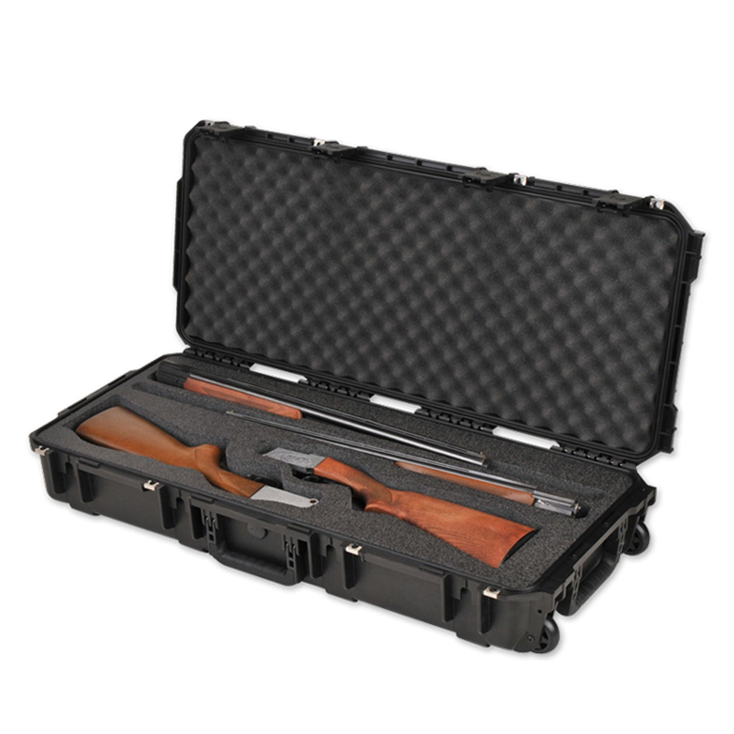 The interior of the gun case features a custom foam insert for secure positioning and cushioning, accommodating 2 barrels and 2 receivers up to 35 inches. This hard case has trigger release latches, reinforced padlock holes, cushioned snap-down handles on 3 sides, and in-line skate style wheels for transporting your gear worry-free.