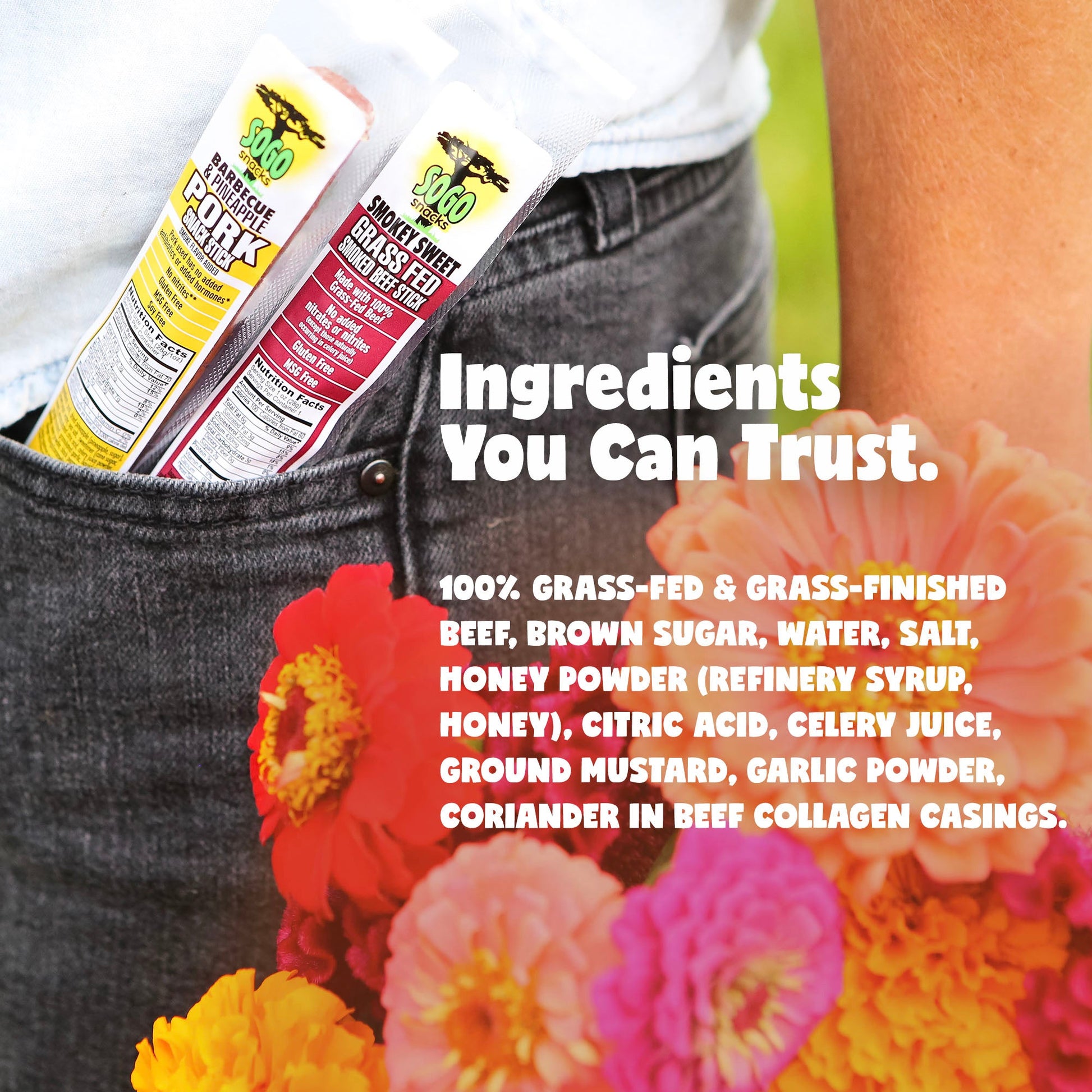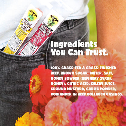 Smokey Sweet Ingredients: Grass-fed & Grass-Finished beef, brown sugar, water, sea salt, honey powder (refinery syrup, honey), citric acid, celery juice, ground mustard, garlic powder, coriander, in beef collagen casings.