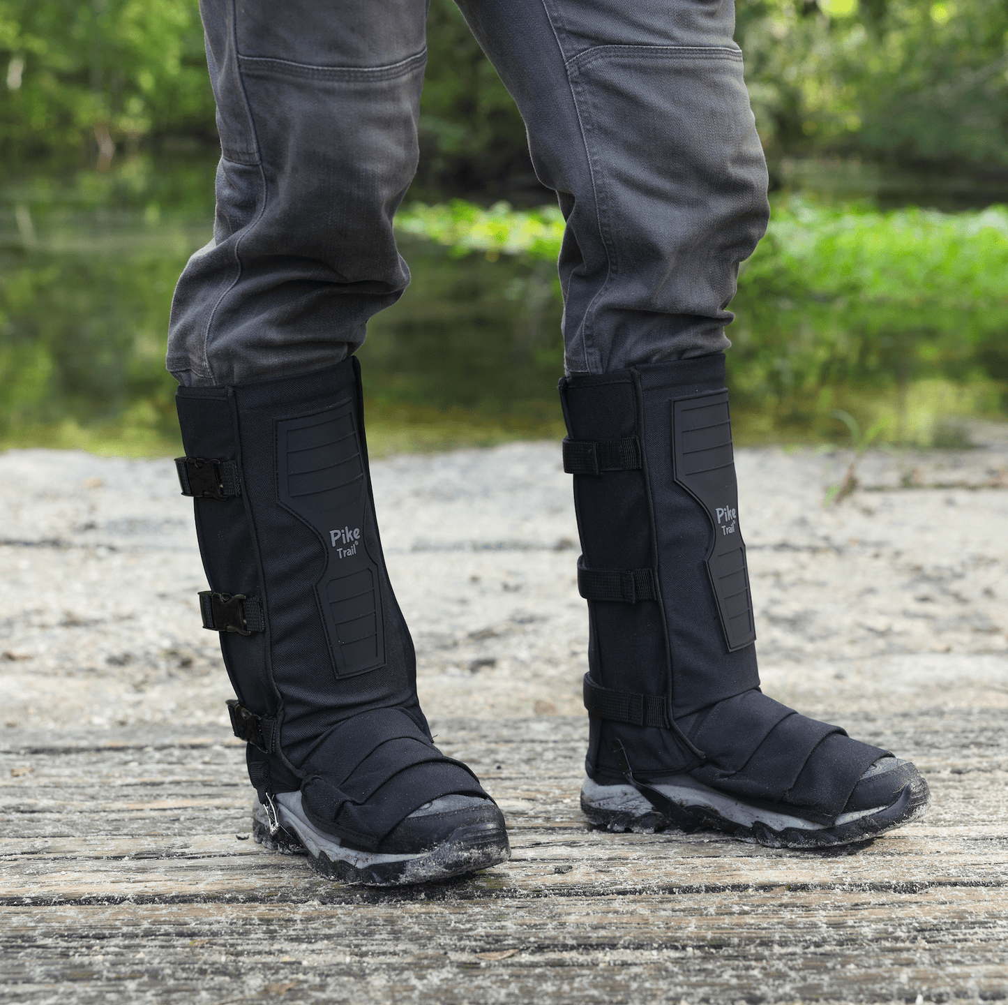 • SMARTER PROTECTION; Our boot gaiters offer 360 degree wraparound protection; With three rustproof stainless steel buckles that secure the trail gaiters firmly in place as well as foot straps that prevent riding up, Pike Trail hunting gaiters are the total protection you need against snakebites in the field