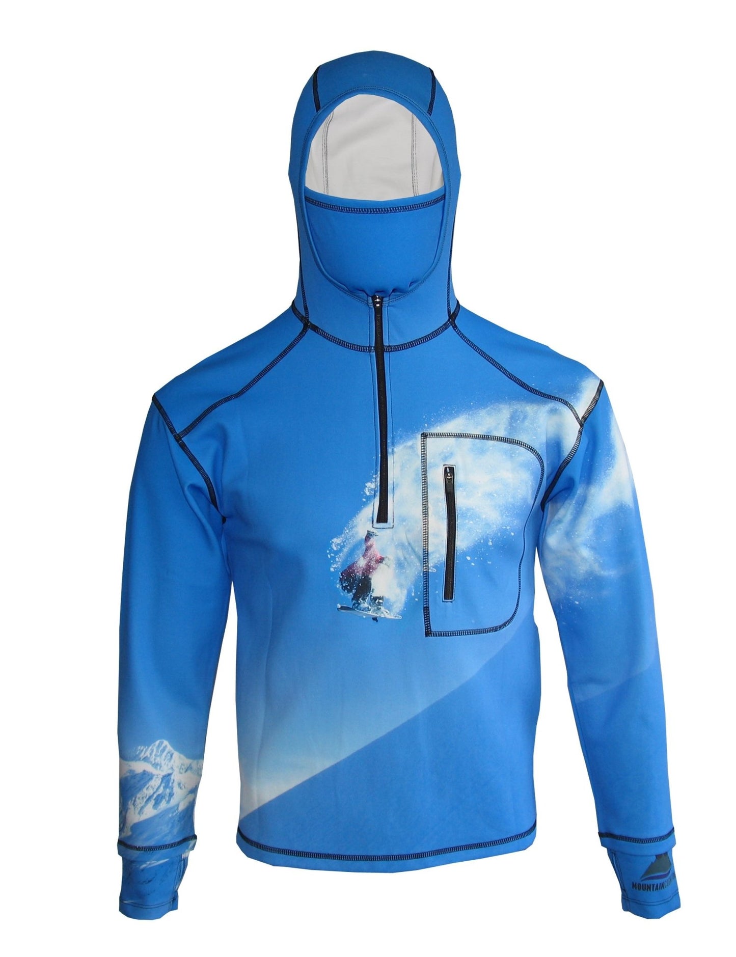The heavyweight 1/4-Zip FlexShell stands as the premier piece in the Mountaincognito outdoor apparel collection, now enhanced with a patented built-in facemask. The "Snowboarder 3" design captures a clear blue sky as a snowboarder soars above the peaks. This advanced hoodie includes thumb-hole cuffs, a zippered chest pocket, an articulated hood, dual side-seam pockets, and flexible-shell fabric that delivers superior comfort and fit. Its wind-resistant, hydrophobic material offers reliable protection against harsh weather conditions. Available for shipment starting July 1, 2025. Similar heavyweight 1/4-Zip hoodies are also offered in the Fincognito Fly Fishing Apparel range.