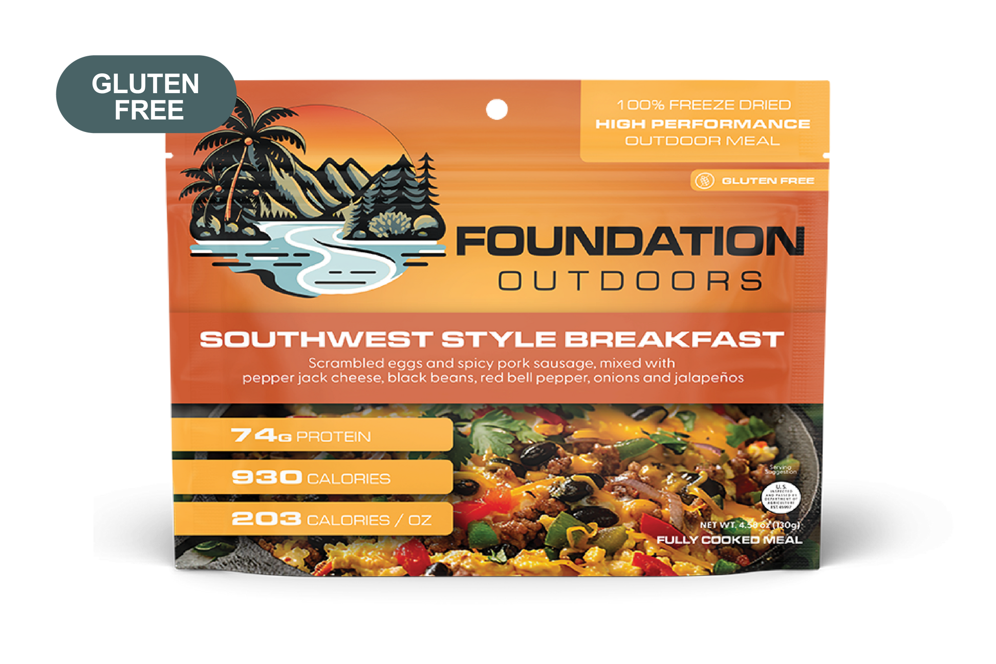 FOUNDATION Outdoors Southwest Style Breakfast Freeze Dried Meal is inspired by the harmonious blend of Texas and Mexican cuisine only found in the Southwestern, USA. Our freeze dried breakfast is another industry first. This meal is like our Rise & Shine Breakfast which contains delicious tasting ingredients like fluffy scrambled eggs, yellow onions, and red and green peppers. If you like Southwest style seasoned ground pork, black beans, peppers, fluffy eggs and melty cheddar cheese, then this is the meal for you. This breakfast is sure to give you the energy and satisfaction you will need for the day ahead.