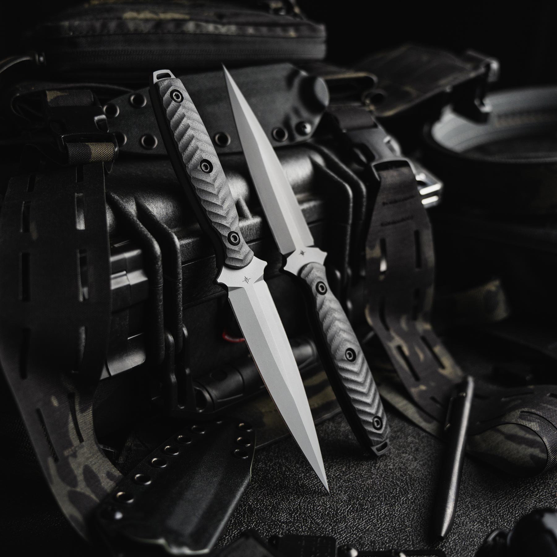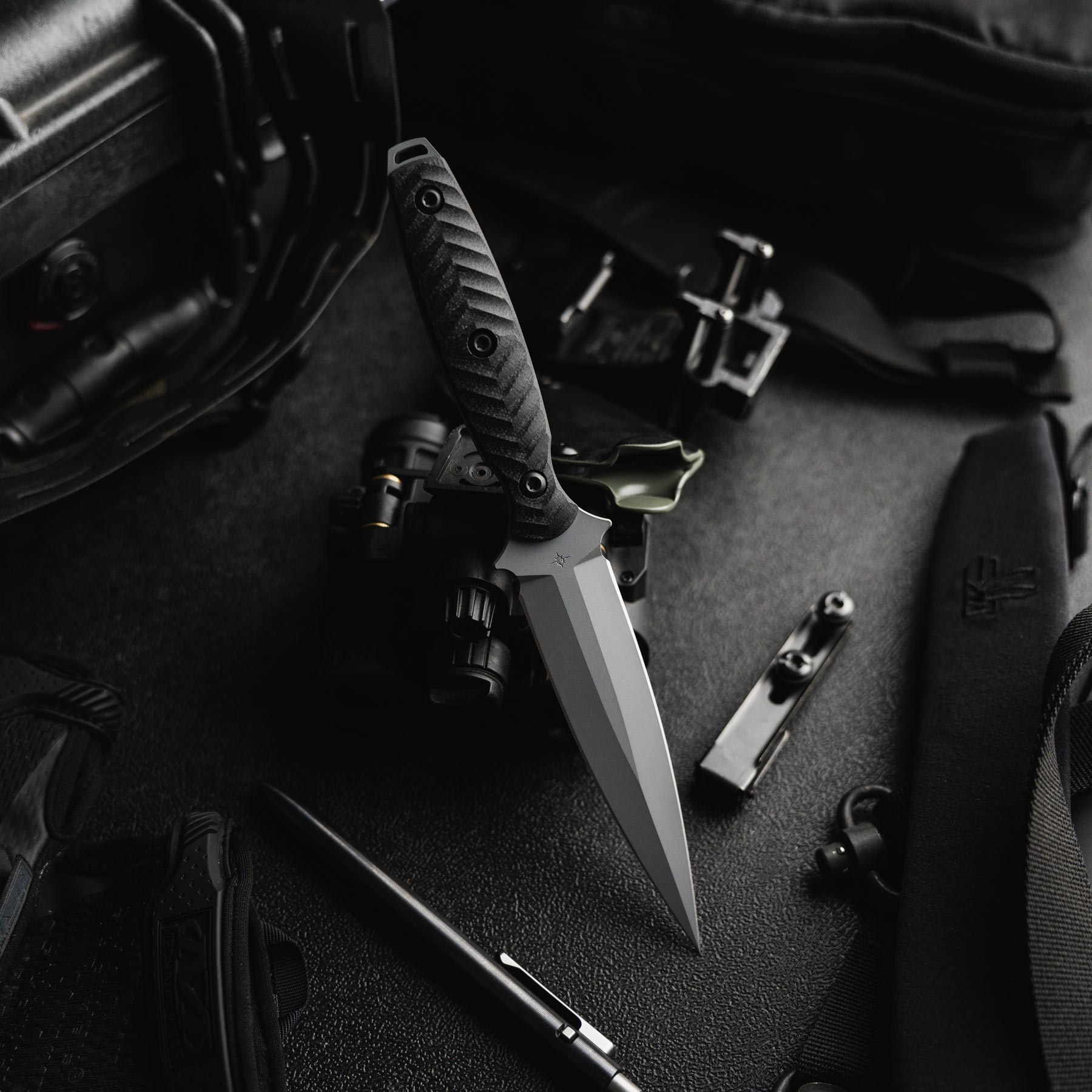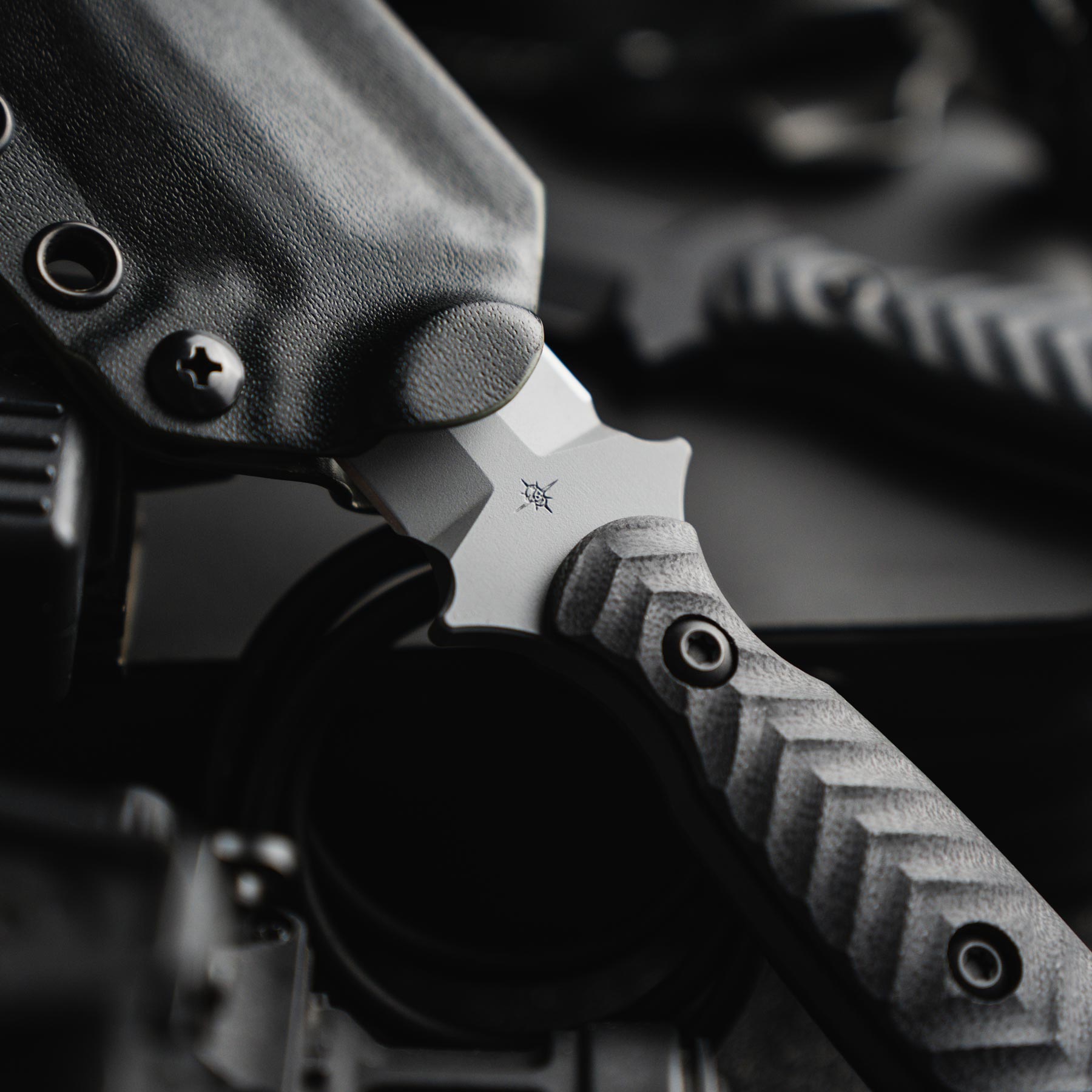 Made from CPM M4 steel, the Specter’s 4.75” blade is cloaked in KG Gunkote, giving it a stealth finish. Available in Phantom Grey and SOCOM Black, each is entirely made here in San Diego, California by our skilled and talented manufacturing team. Every Specter includes a DuoTone™ KYDEX® sheath, with easy retention adjustability and multiple friction offsets to eliminate blade rattle.