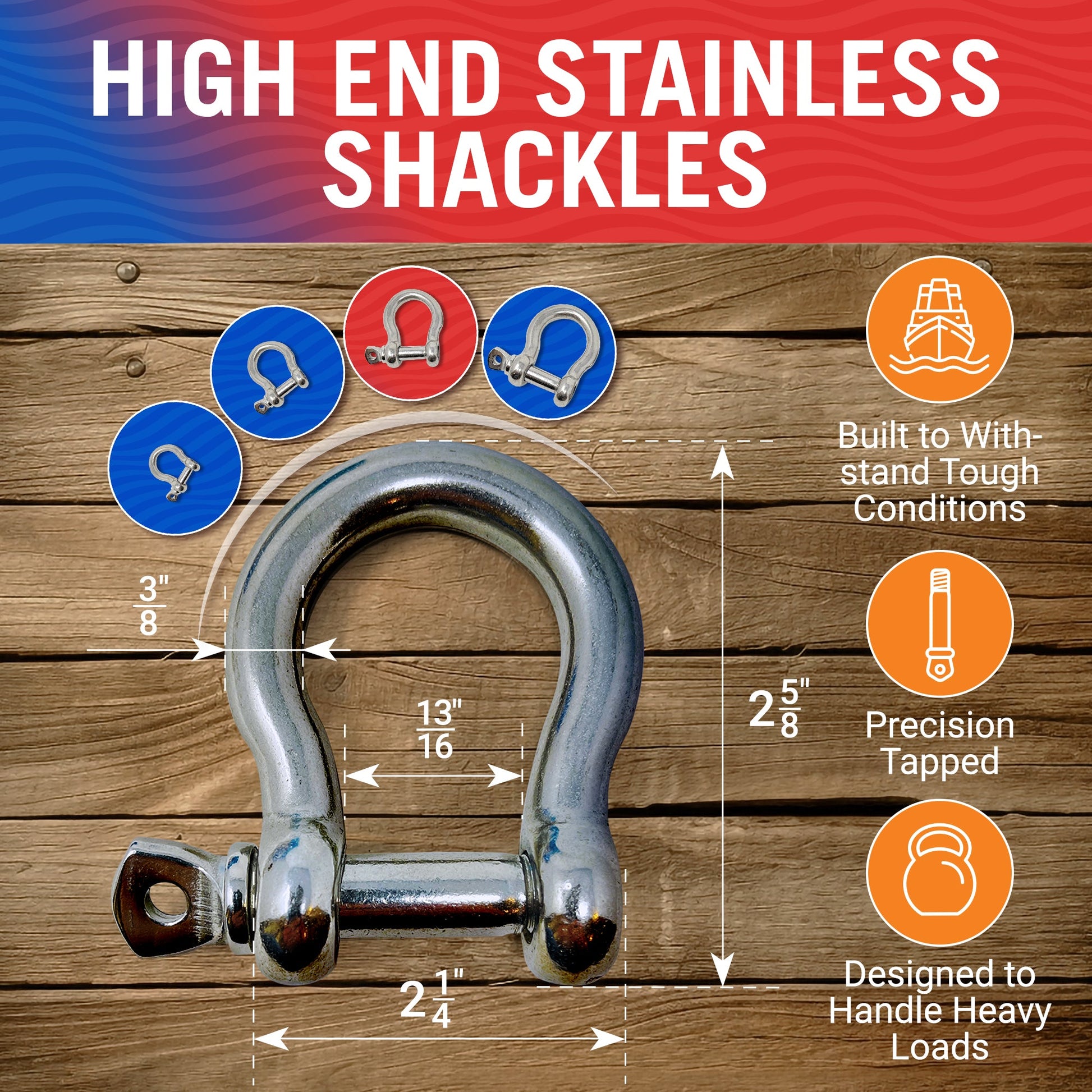 - ROBUST AND POWERFUL: Engineered for resilience, our D shackle set excels in challenging environments, promising enduring utility. Our robust 1/2" shackles deliver a 3000lb working load and a 15000lb breaking load. The 3/8" models offer a 2500lb working load and a 12000lb breaking load. For lighter applications, our 5/16" shackles provide a 1300lb working load and a 6600lb breaking load, while the 1/4" versions have a 750lb working load and a 3800lb breaking load. Ideal for use as clevis shackles or bow rings.