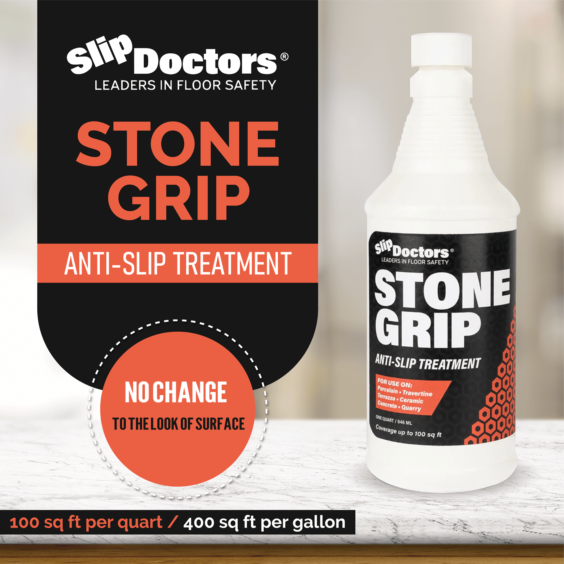 Our best seller! Stone Grip Non-Slip Tile Treatment for Porcelain Tiles, Ceramic Tiles & Stone Floors. Stone Grip anti-slip tile and stone floor treatment will dramatically increase traction and improve safety on slippery floors even when wet. The slip resistance will surpass guidelines recommended by ADA/ANSI for floor safety, work best in wet barefoot or shoe conditions.