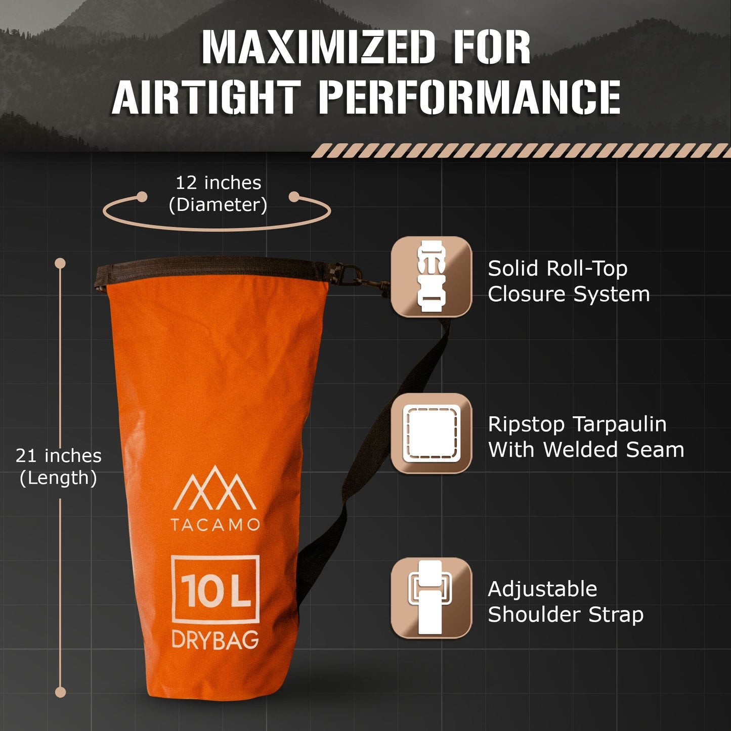 - RIP-PROOF, PUNCTURE-PROOF, TEAR-PROOF - This 10L small waterproof dry bag is made of ripstop tarpaulin with welded seams to withstand tough adventures. Safeguard your valuables while canoeing, fishing, hiking, or camping in rain, snow, sand, and mud.