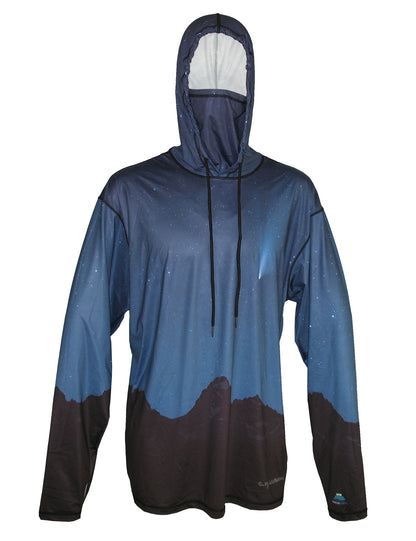 Our Mountaincognito wildlife graphic hoodie series includes "Teton Comet" which captures the Neowise Comet over the iconic Teton Mountains of Grand Teton National Park. Photographic picture hoodie art by Charlie Lansche. The sun protective UPF50 Sunpro Hoodie features a lightweight (150gr.) 4-way stretch fabric (85% polyester 15% Spandex) for comfort and fit unmatched. An internal neck gaiter built into the hood is included for free. Great sun protection, moisture wicking apparel.