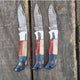 Check out the Texas Flag Handle Folding Pocket knife by KBS Knives Store. Featuring a bone, exotic blue and red wood, and steel bolster handle, each adorned with the iconic Texas flag, this knife is sure to turn heads. The blade length is 3 inches, making it the perfect size for everyday carry or outdoor activities. This knife comes with a sleek leather case to keep it safe and secure.