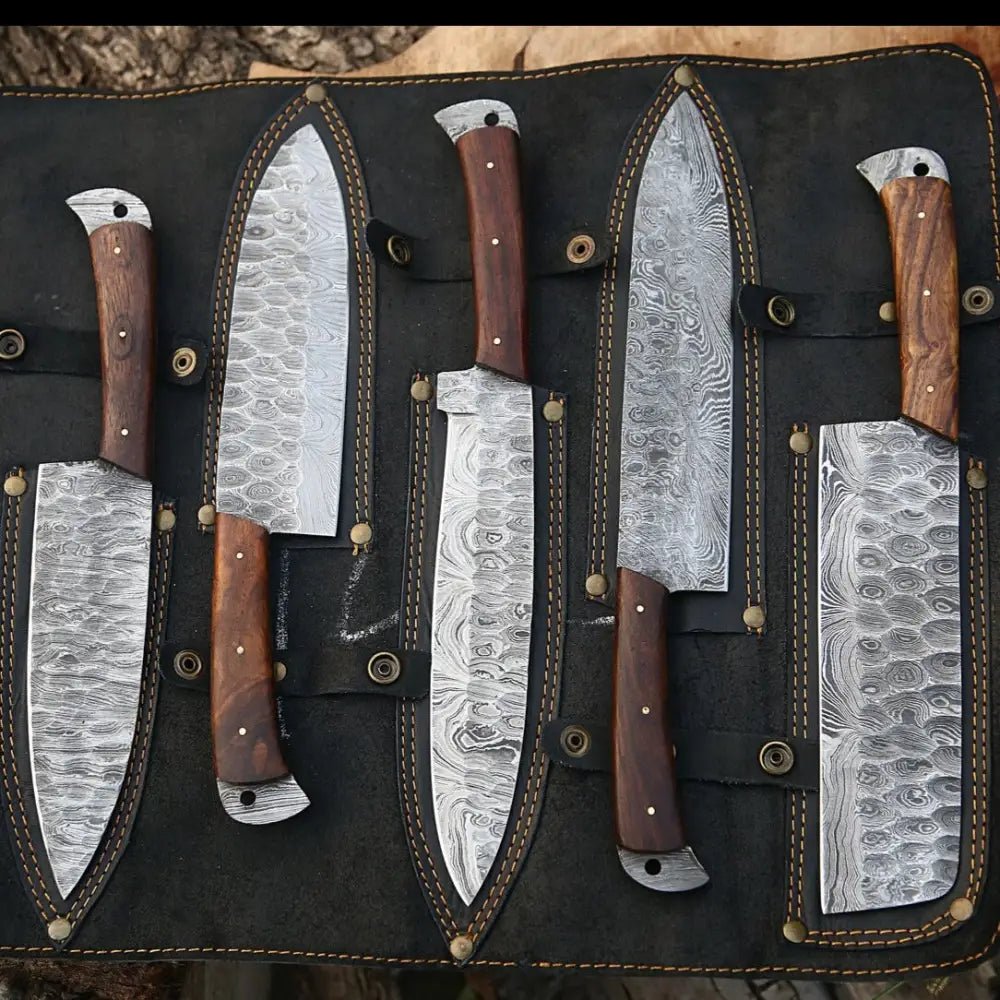 Crafted with precision and care, The Black Rose from White Hills Knives is a versatile 5 piece chef knife set that includes a custom leather roll for convenient on-the-go storage. Made from durable and elegant Damascus steel, these knives maintain a sharp edge while providing flexibility. Sourced from top quality materials all around the world, this set will undoubtedly become the centerpiece of your kitchen. The 5-Piece Damascus Steel Chef Knife Set boasts meticulous craftsmanship and a durable, sharp, and long-lasting blade. Its full tang design and triple-riveted natural wood handles ensure exceptional balance and control. The unique patterns on each blade add a touch of sophistication, making these knives one-of-a-kind. As an added bonus, we provide a complimentary custom-made leather roll for secure and organized storage of your knives. Whether you're an experienced chef or a home cook, these knives are sure to become an essential part of your kitchen.