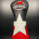 The headcover is designed to fit snugly over the club head, keeping it safe from scratches and damage during transportation and storage. It may have practical features such as a stretchy fabric or an adjustable closure to ensure a secure fit on various club sizes.