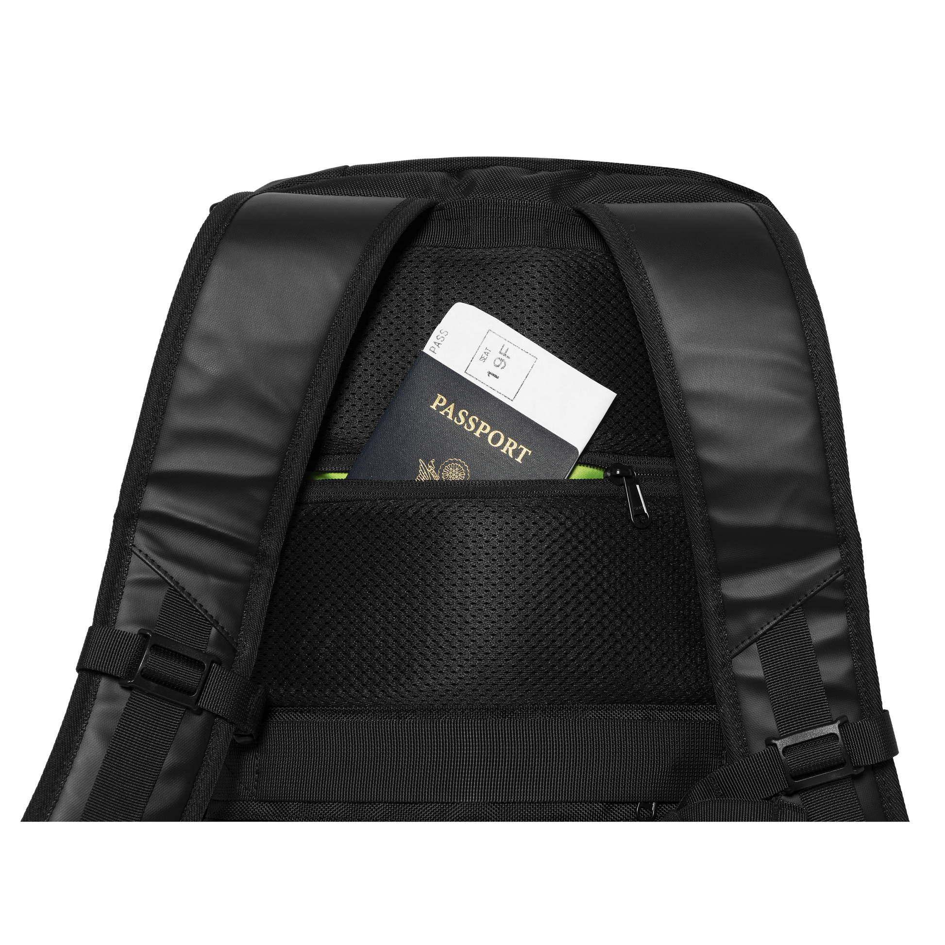 - Two (2) hidden pockets on the back-panel for travel documents. One zipper is hidden under the carry-on luggage handle wrap and not visible to the eye.