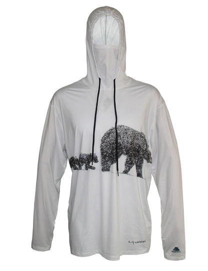 Our Mountaincognito wildlife animal graphic hoodie series includes "Three Bears" that shows the first trip outside of the den for two cubs and their mom in Yellowstone National Park. Photographic picture hoodie art by Charlie Lansche. The sun protective UPF50 Sunpro Hoodie features a lightweight (150gr.) 4-way stretch fabric (85% polyester 15% Spandex) for comfort and fit unmatched. An internal neck gaiter built into the hood is included for free. Great sun protection, moisture wicking apparel.