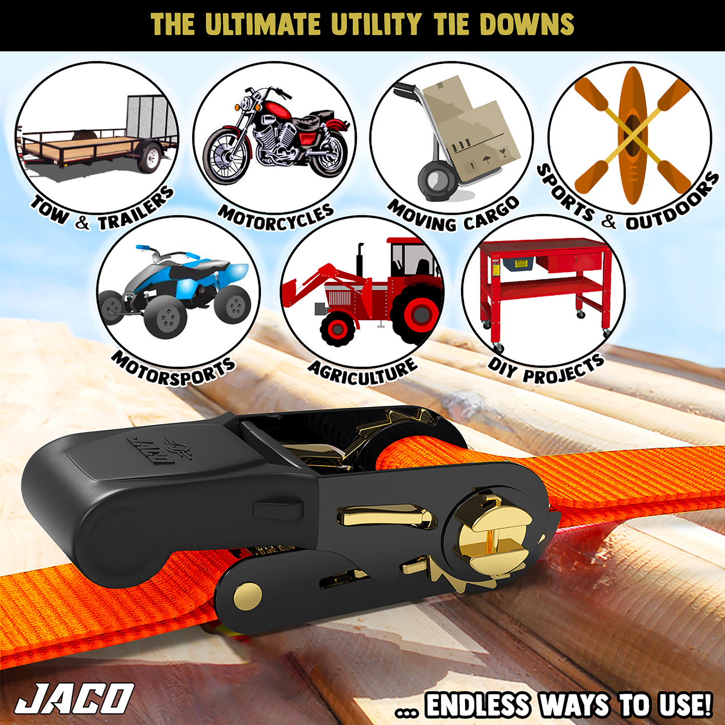 - Built to last for the toughest tie down jobs - from securing your motorcycle, ATV, UTV, kayak, paddle board, dirtbike, moving supplies, or accessories - to cargo on the roof rack, utility trailer, or pickup truck bed - to any job that requires a good ol' reliable tiedown.
