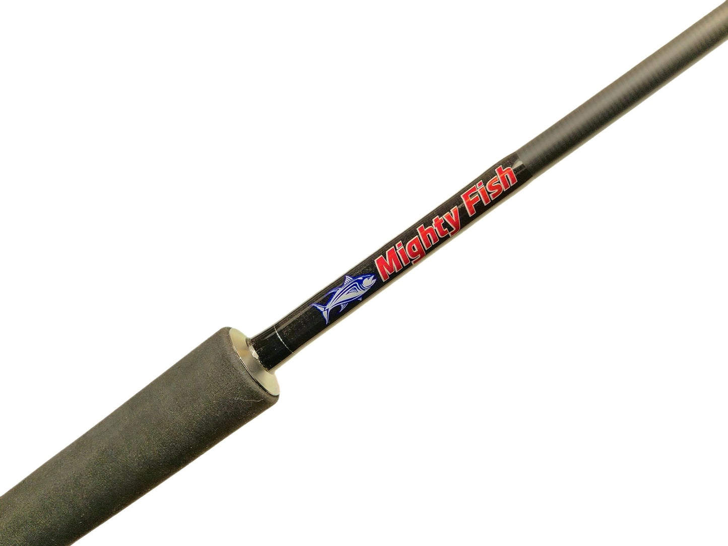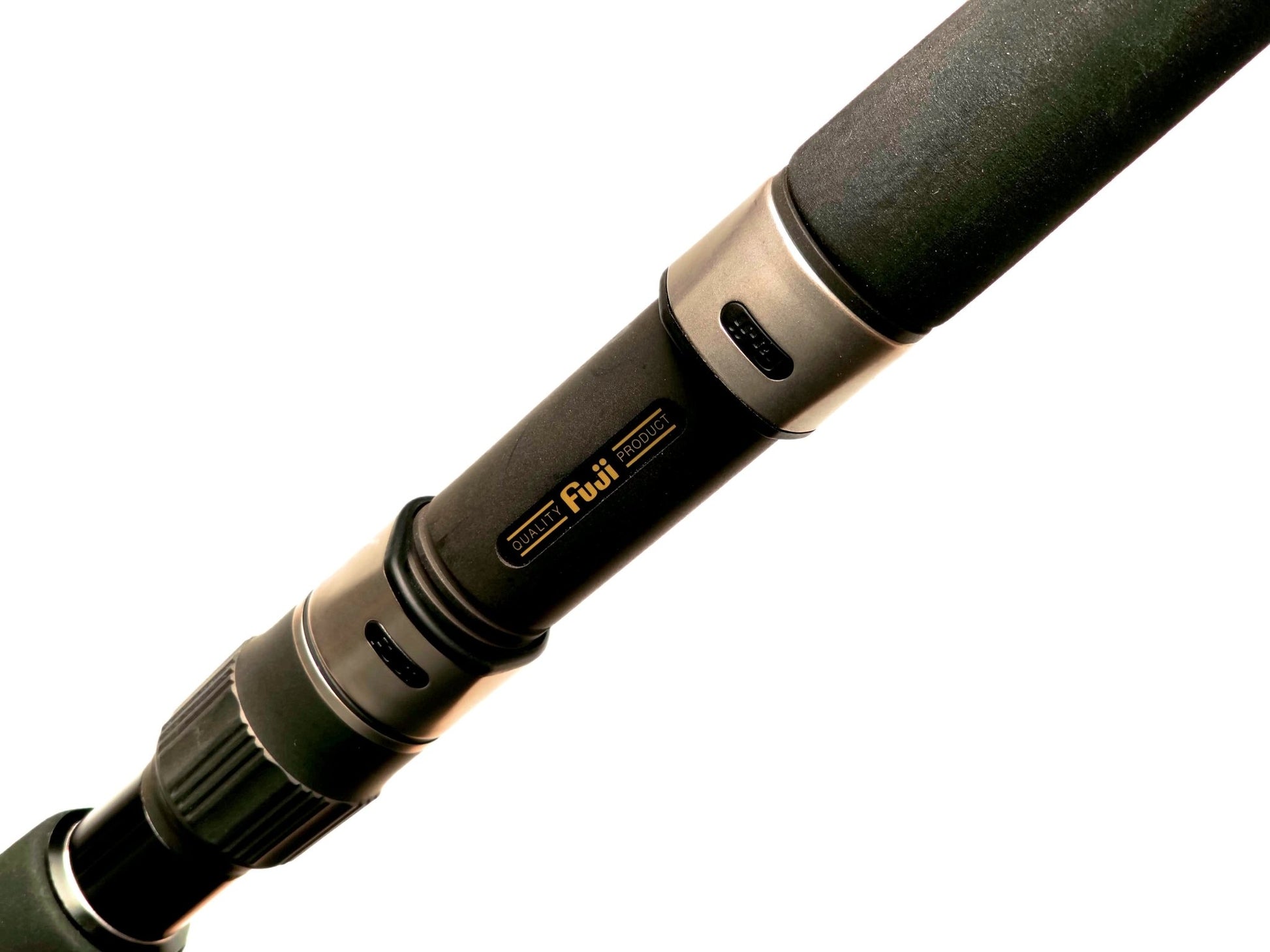 This rod is designed for jigging giant bluefin tuna and is a favorite among charter captains. Its thick walled moderate action carbon blank provides parabolic lifting power of over 30lbs. It also features a textured rubber shrink over contoured EVA foregrip, a matching rear grip, and a Fuji Long Nut barrel seat with an aluminum spacer that can comfortably accommodate reels ranging from 10,000 to 20,000 in size. Additionally, it is equipped with Fuji KW alconite guides and an aluminum gimbal, along with aluminum winding checks.
