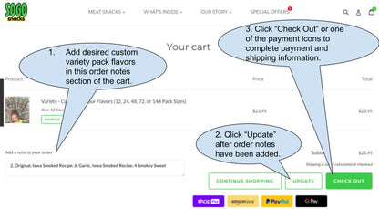 Make a custom variety pack of the exact quantities of flavors you want, with twelve flavors to choose from. Select the total order count size desired here, click "add to cart", then detail the flavors and quantities in the notes section of the cart. It's that easy!