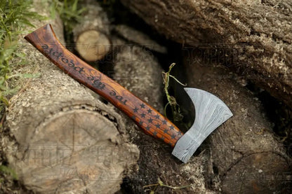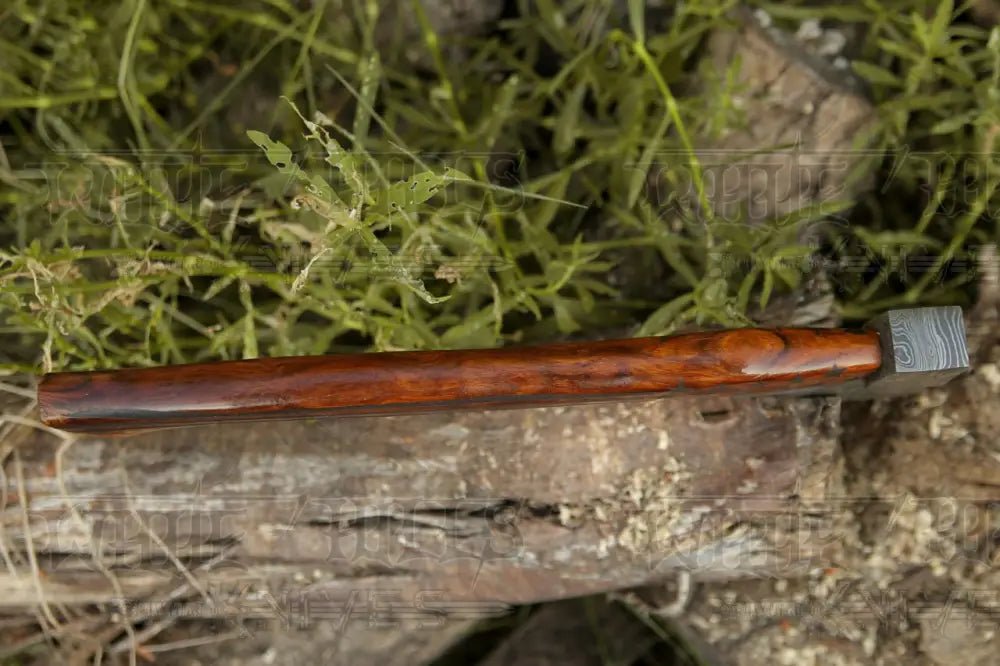 With a patriotic "American" theme, the wood handle displays an engraving of "We the People" and an abstract American flag design. The handle consists of wood, while the steel head is a combination of 15N20 and 1095 with high carbon metal. Handcrafted from Damascus steel, each chopper is one-of-a-kind and unreplicable.