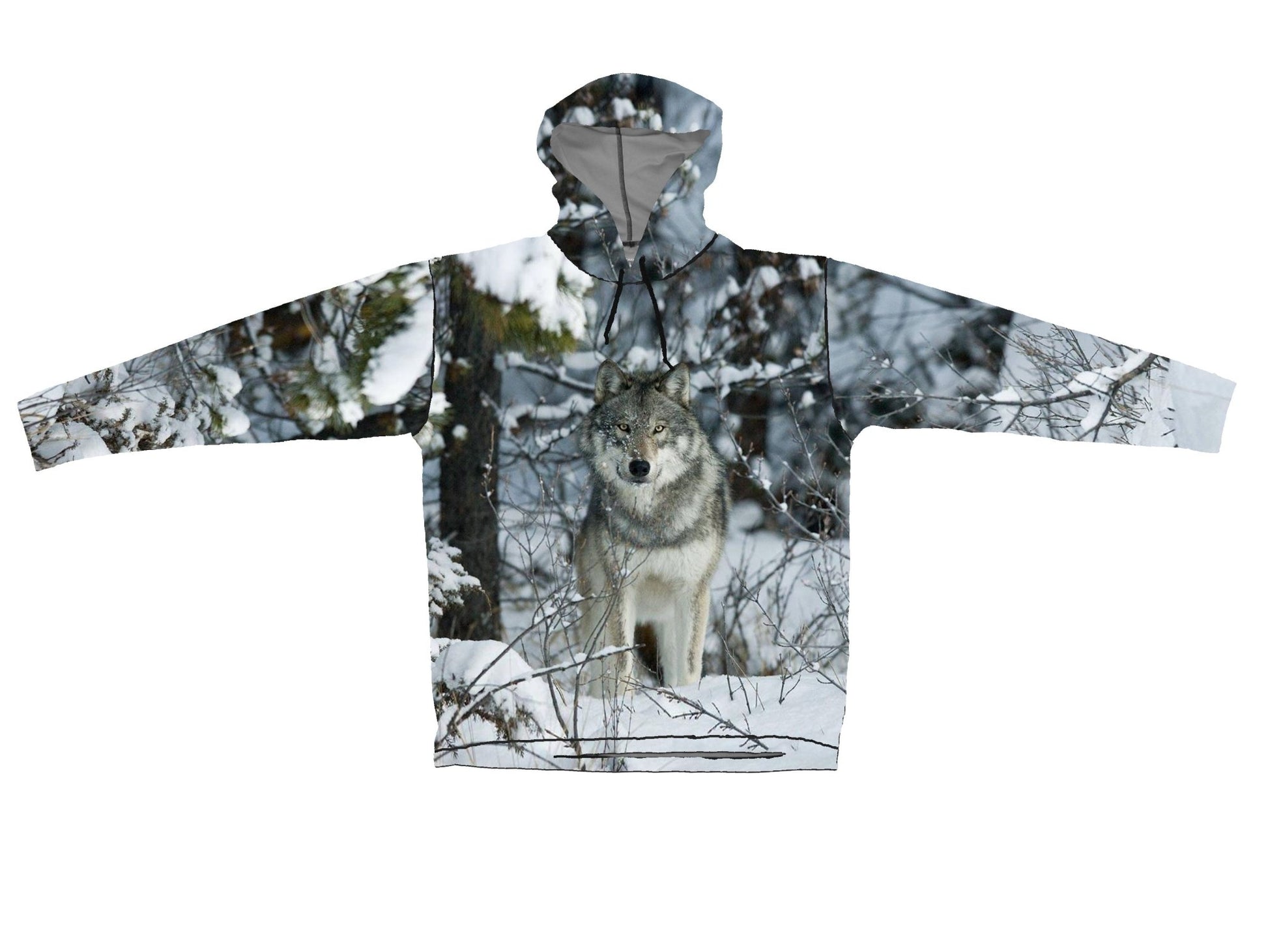 Our Mountaincognito wildlife animal graphic hoodie series includes "Wolf", a wild winter grey wolf in northern Montana. Photographic picture hoodie art by Donald Jones. The sun protective UPF50 SunPro Hoodie features a lightweight (150gr.) 4-way stretch fabric (85% polyester 15% Spandex) for comfort and fit unmatched. An internal neck gaiter built into the hood is included for free. Great sun protection, moisture wicking apparel. ORDER NOW FOR AN EXPECTED SHIP DATE: JUNE 1, 2025.