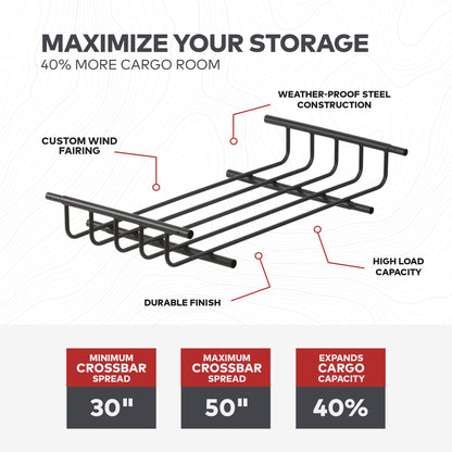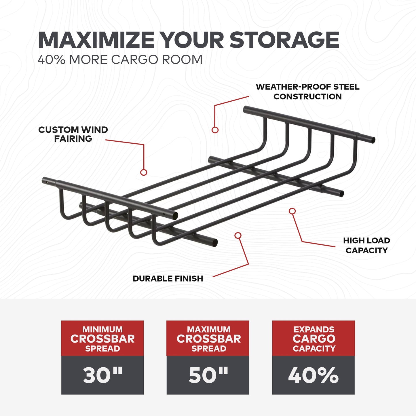 To silence the wind, the LoadWarrior features custom wind fairing, reducing noise and boosting its aerodynamic prowess. For peace of mind, the SKS locking bracket (sold separately) guards your cargo securely against any challenge. Featuring an accessory bar, this travel essential allows you to accommodate a variety of YAKIMA accessories. This vehicle cargo basket extension requires a crossbar that is a minimum of 30 inches.